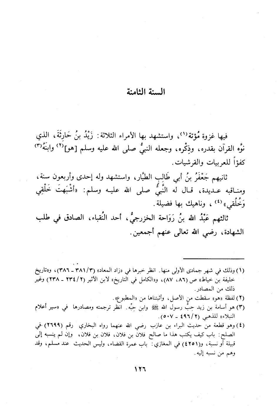 فيها غزوة مؤتة [1] ، واستشهد بها الأمراء الثلاثة: زيد بن حارثة، الذي نوّه القرآن بقدره، وذكره، وجعله النبيّ صلى الله عليه وسلم [هو] [2] وابنه [3] كفؤا للعربيات والقرشيات.