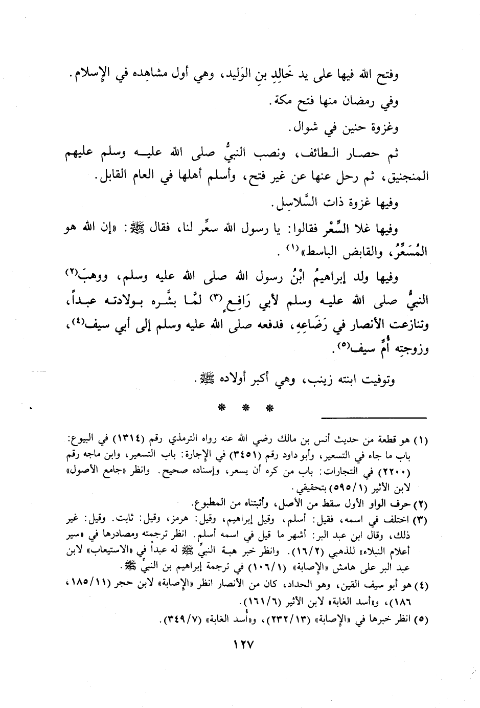 وفيها غلا السّعر فقالوا: يا رسول الله سعّر لنا، فقال صلى الله عليه وسلم: «إن الله هو المسعّر، والقابض الباسط» [1] . وفيها ولد إبراهيم ابن رسول الله صلى الله عليه وسلم، ووهب [2] النبيّ صلى الله عليه وسلم لأبي رافع [3] لمّا بشّره بولادته عبدا، وتنازعت الأنصار في رضاعه، فدفعه صلى الله عليه وسلم إلى أبي سيف [4] ، وزوجته أمّ سيف [5] .