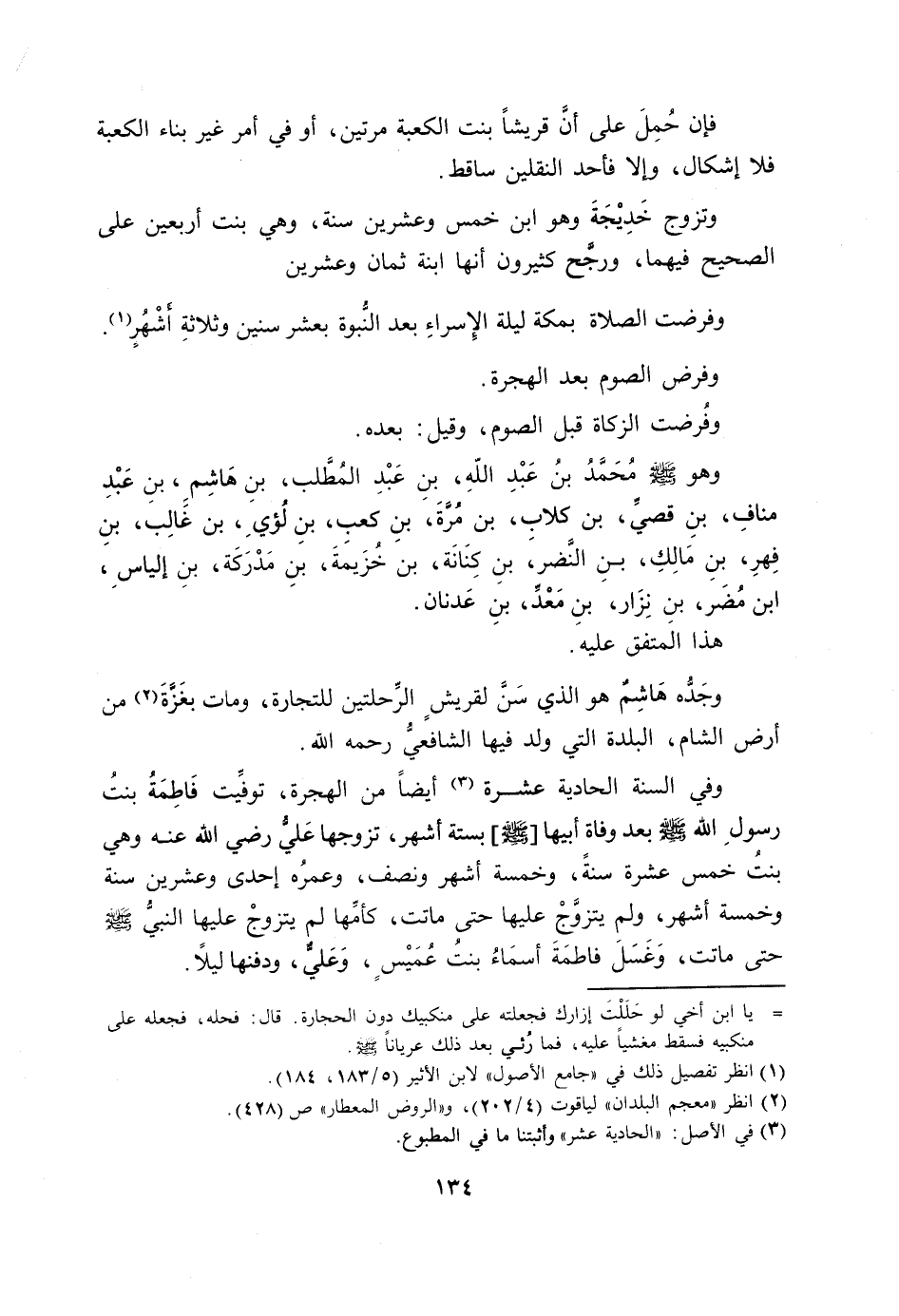 وتزوج خديجة وهو ابن خمس وعشرين سنة، وهي بنت أربعين على الصحيح فيهما، ورجّح كثيرون أنها ابنة ثمان وعشرين وفرضت الصلاة بمكة ليلة الإسراء بعد النّبوة بعشر سنين وثلاثة أشهر [1] .