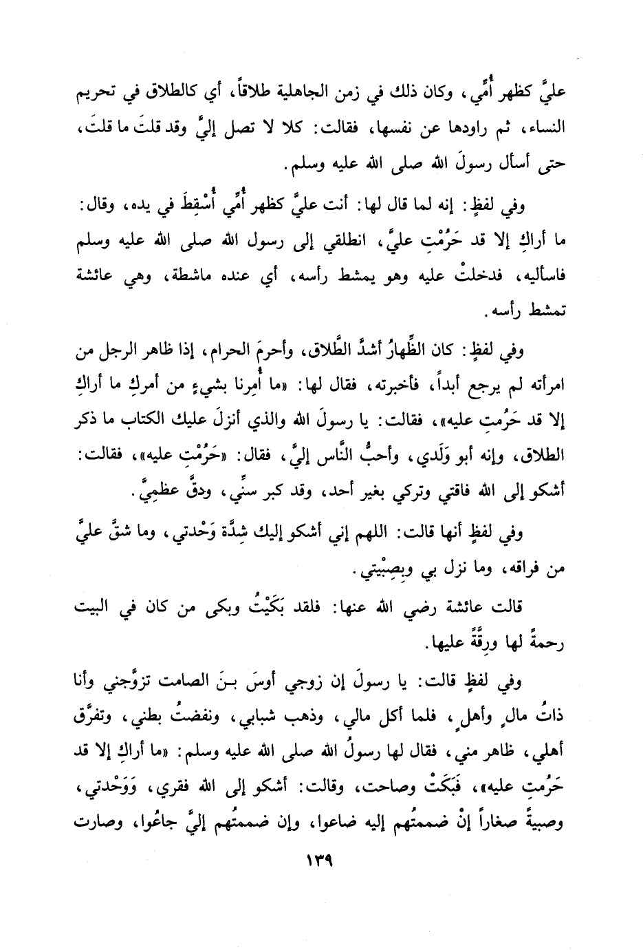 عليّ كظهر أمّي، وكان ذلك في زمن الجاهلية طلاقا، أي كالطلاق في تحريم النساء، ثم راودها عن نفسها، فقالت: كلا لا تصل إليّ وقد قلت ما قلت، حتى أسأل رسول الله صلى الله عليه وسلم.