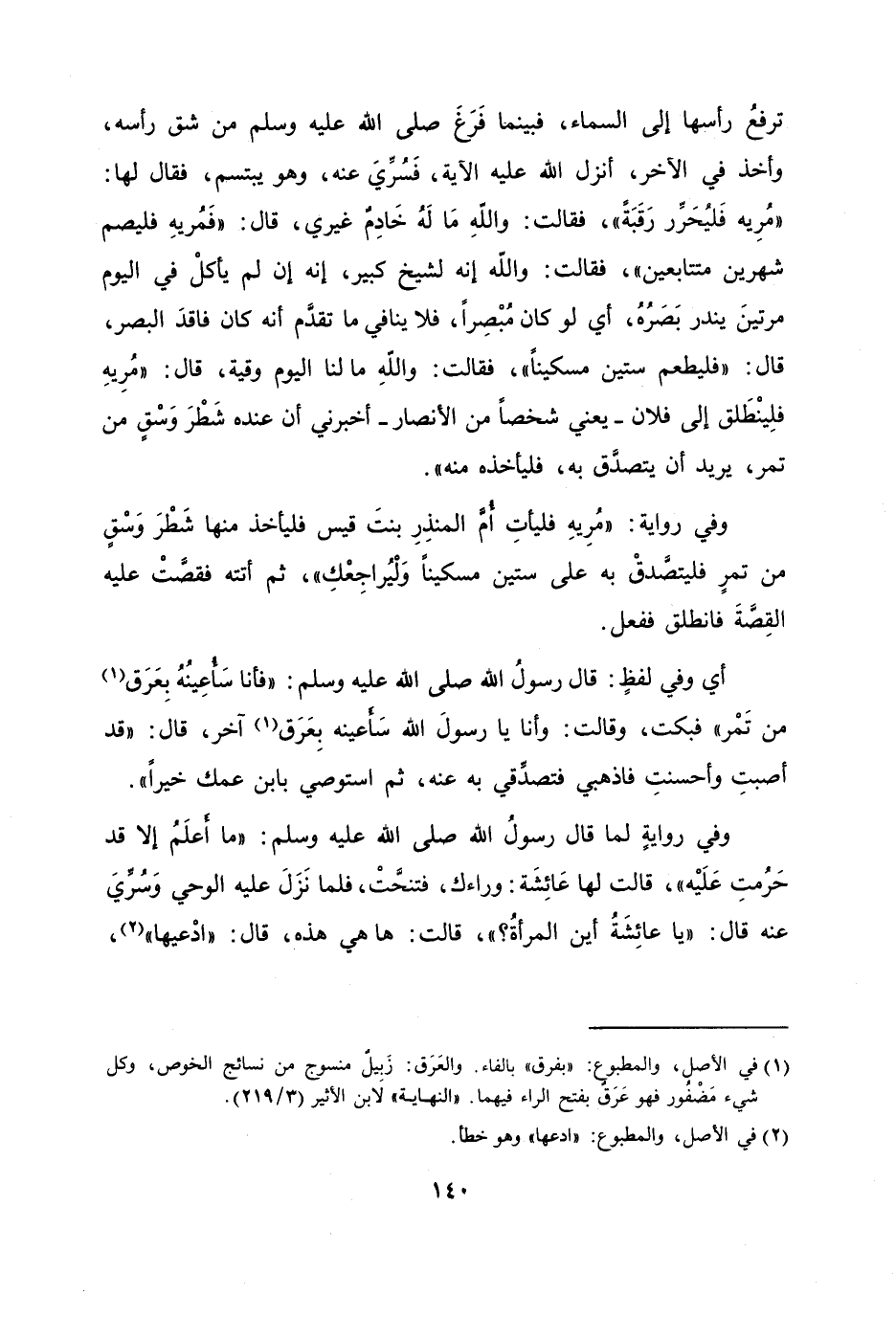 أي وفي لفظ: قال رسول الله صلى الله عليه وسلم: «فأنا سأعينه بعرق [1] من تمر» فبكت، وقالت: وأنا يا رسول الله سأعينه بعرق [1] آخر، قال: «قد أصبت وأحسنت فاذهبي فتصدّقي به عنه، ثم استوصي بابن عمك خيرا» . وفي رواية لما قال رسول الله صلى الله عليه وسلم: «ما أعلم إلا قد حرمت عليه» ، قالت لها عائشة: وراءك، فتنحّت، فلما نزل عليه الوحي وسرّي عنه قال: «يا عائشة أين المرأة؟» ، قالت: ها هي هذه، قال: «ادعيها» [2] ،