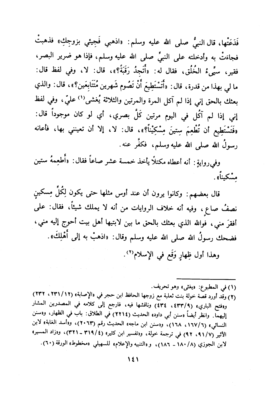 [2] وقد أورد قصة خولة بنت ثعلبة مع زوجها الحافظ ابن حجر في «الإصابة» (12/ 231، 232) و «فتح الباري» (9/ 433، 434) وناقشها فيه، فارجع إلى كلامه في المصدرين المشار إليهما. وانظر أيضا «سنن أبي داود» الحديث (2214) في الطلاق: باب في الظهار، و «سنن النسائي» (6/ 167، 168) ، و «سنن ابن ماجة» الحديث رقم (2063) ، و «أسد الغابة» لابن الأثير (7/ 91، 92) في ترجمة خولة، و «تفسير ابن كثير» (4/ 319- 321) ، و «زاد المسير» لابن الجوزي (8/ 180- 186) ، و «التنبيه والإعلام» للسهيلي «مخطوط» الورقة (60) .