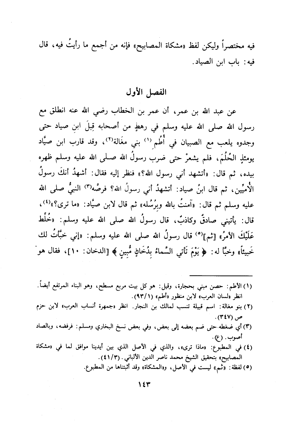 فيه مختصرا وليكن لفظ «مشكاة المصابيح» فإنه من أجمع ما رأيت فيه، قال فيه: باب ابن الصياد.