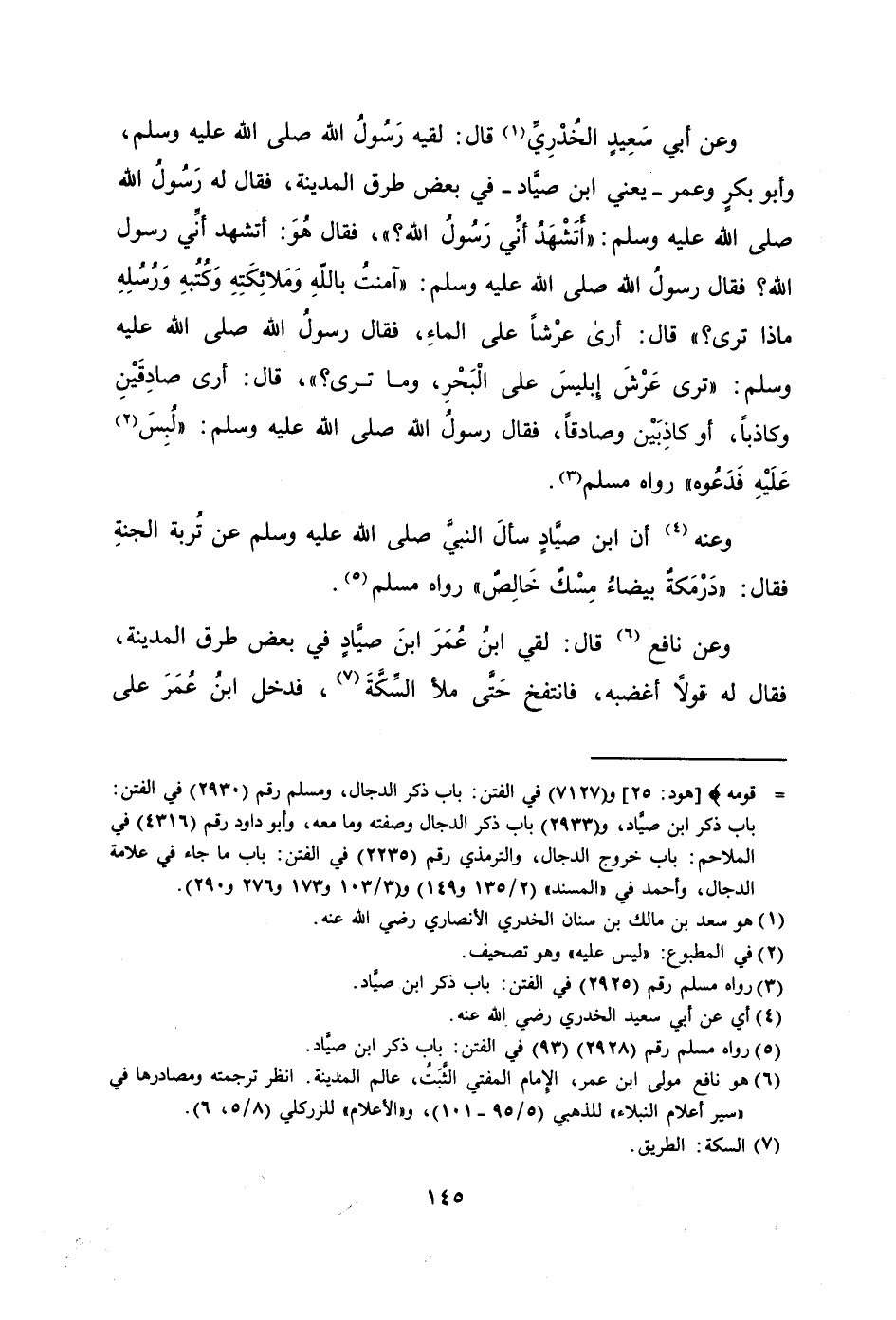 وعن أبي سعيد الخدريّ [1] قال: لقيه رسول الله صلى الله عليه وسلم، وأبو بكر وعمر- يعني ابن صيّاد- في بعض طرق المدينة، فقال له رسول الله صلى الله عليه وسلم: «أتشهد أنّي رسول الله؟» ، فقال هو: أتشهد أنّي رسول الله؟ فقال رسول الله صلى الله عليه وسلم: «آمنت بالله وملائكته وكتبه ورسله ماذا ترى؟» قال: أرى عرشا على الماء، فقال رسول الله صلى الله عليه وسلم: «ترى عرش إبليس على البحر، وما ترى؟» ، قال: أرى صادقين وكاذبا، أو كاذبين وصادقا، فقال رسول الله صلى الله عليه وسلم: «لبس [2] عليه فدعوه» رواه مسلم [3] . وعنه [4] أن ابن صيّاد سأل النبيّ صلى الله عليه وسلم عن تربة الجنة فقال: «درمكة بيضاء مسك خالص» رواه مسلم [5] . وعن نافع [6] قال: لقي ابن عمر ابن صيّاد في بعض طرق المدينة، فقال له قولا أغضبه، فانتفخ حتّى ملأ السّكّة [7] ، فدخل ابن عمر على
