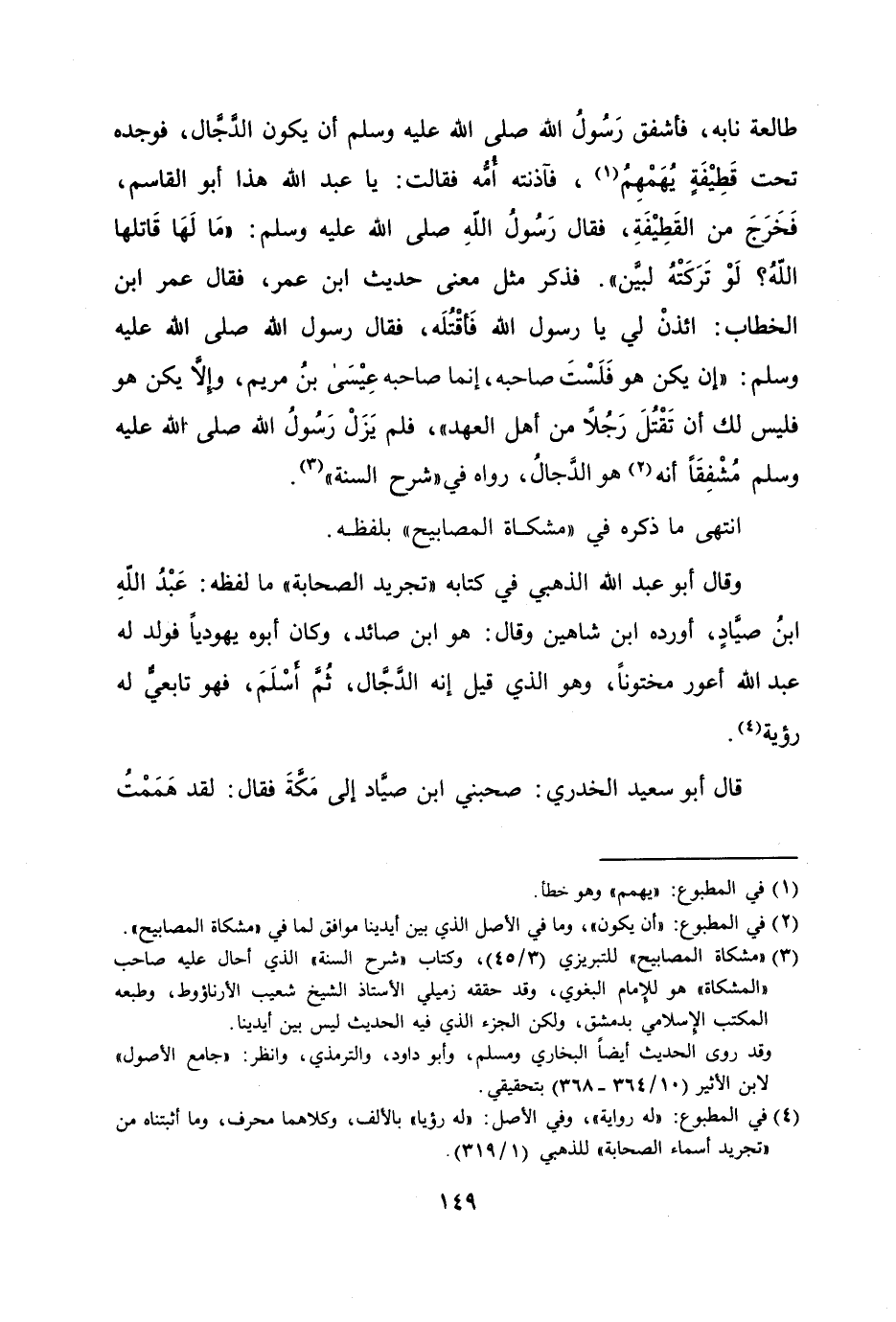 وقال أبو عبد الله الذهبي في كتابه «تجريد الصحابة» ما لفظه: عبد الله ابن صيّاد، أورده ابن شاهين وقال: هو ابن صائد، وكان أبوه يهوديا فولد له عبد الله أعور مختونا، وهو الذي قيل إنه الدّجّال، ثمّ أسلم، فهو تابعيّ له رؤية [4] .