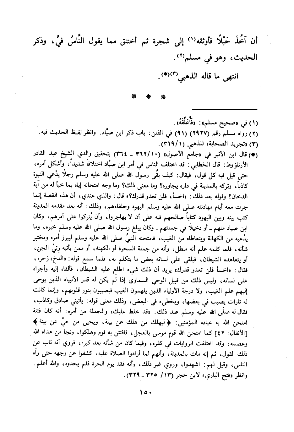 [4] قال ابن الأثير في «جامع الأصول» (10/ 362- 364) بتحقيق والدي الشيخ عبد القادر الأرناؤوط: قال الخطابي: قد اختلف الناس في أمر ابن صيّاد اختلافا شديدا، وأشكل أمره، حتى قيل فيه كل قول، فيقال: كيف بقّى رسول الله صلى الله عليه وسلم رجلا يدّعي النبوة كاذبا، وتركه بالمدينة في داره يجاوره؟ وما معنى ذلك؟ وما وجه امتحانه إياه بما خبأ له من آية الدخان؟ وقوله بعد ذلك: «اخسأ، فلن تعدو قدرك؟» قال: والذي عندي، أن هذه القصة إنما جرت معه أيام مهادنته صلى الله عليه وسلم اليهود وحلفاءهم، وذلك: أنه بعد مقدمه المدينة كتب بينه وبين اليهود كتابا صالحهم فيه على أن لا يهاجروا، وأن يتركوا على أمرهم، وكان ابن صياد منهم- أو دخيلا في جملتهم- وكان يبلغ رسول الله صلى الله عليه وسلم خبره، وما يدّعيه من الكهانة ويتعاطاه من الغيب، فامتحنه النبيّ صلى الله عليه وسلم ليبرز أمره ويختبر شأنه، فلما كلمه علم أنه مبطل، وأنه من جملة السحرة أو الكهنة، أو ممن يأتيه رئي الجن، أو يتعاهده الشيطان، فيلقي على لسانه بعض ما يتكلم به، فلما سمع قوله: «الدخ» زجره، فقال: «اخسأ فلن تعدو قدرك» يريد أن ذلك شيء اطلع عليه الشيطان، فألقاه إليه وأجراه على لسانه، وليس ذلك من قبيل الوحي السماوي إذا لم يكن له قدر الأنبياء الذين يوحى إليهم على الغيب، ولا درجة الأولياء الذين يلهمون الغيب فيصيبون بنور قلوبهم، وإنما كانت له تارات يصيب في بعضها، ويخطئ في البعض، وذلك معنى قوله: يأتيني صادق وكاذب، فقال له صلى الله عليه وسلم عند ذلك: «قد خلط عليك» والجملة من أمره: أنه كان فتنة امتحن الله به عباده المؤمنين: لِيَهْلِكَ من هَلَكَ عَنْ بَيِّنَةٍ، وَيَحْيى من حَيَّ عَنْ بَيِّنَةٍ 8: 42 [الأنفال: 42] كما امتحن الله قوم موسى بالعجل، فافتتن به قوم وهلكوا، ونجا من هداه الله وعصمه، وقد اختلفت الروايات في كفره، وفيما كان من شأنه بعد كبره، فروي أنه تاب عن ذلك القول، ثم إنه مات بالمدينة، وأنهم لما أرادوا الصلاة عليه، كشفوا عن وجهه حتى رآه الناس، وقيل لهم: اشهدوا، وروي غير ذلك، وأنه فقد يوم الحرة فلم يجدوه، والله أعلم.