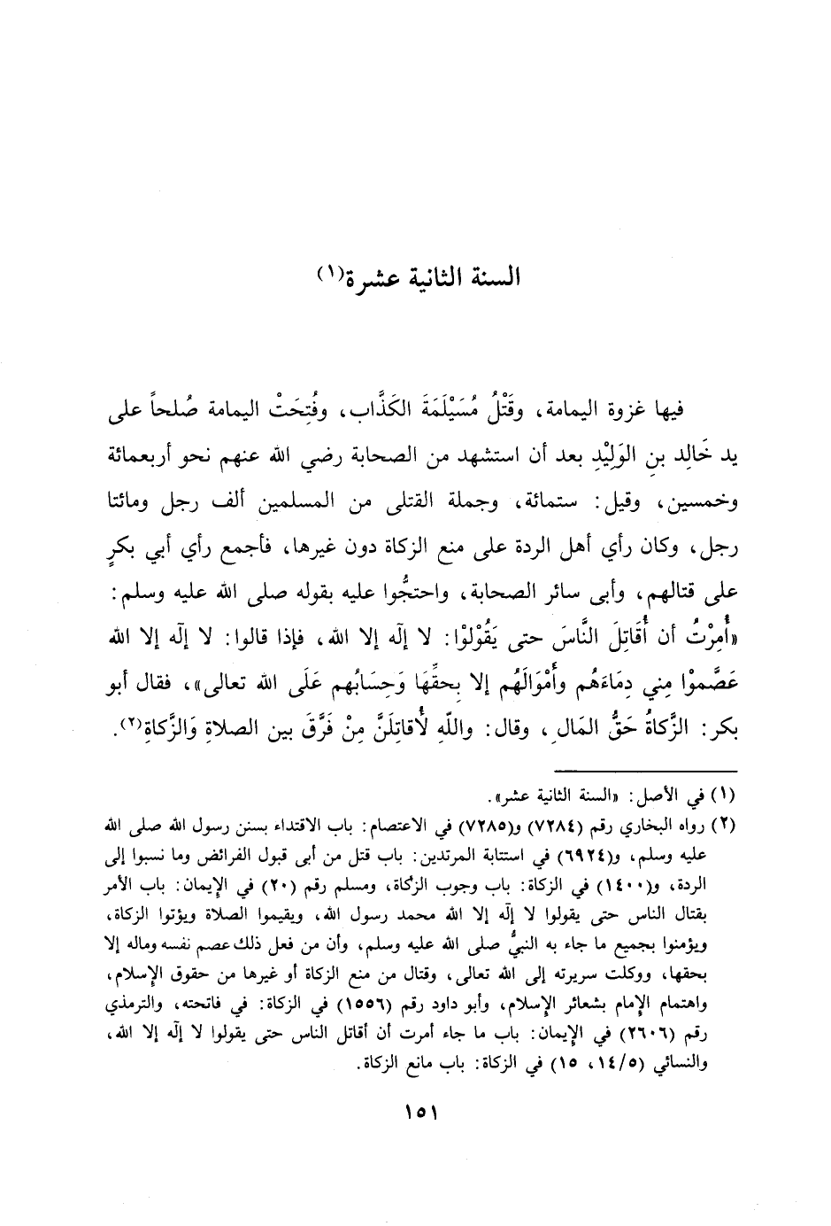 فيها غزوة اليمامة، وقتل مسيلمة الكذّاب، وفتحت اليمامة صلحا على يد خالد بن الوليد بعد أن استشهد من الصحابة رضي الله عنهم نحو أربعمائة وخمسين، وقيل: ستمائة، وجملة القتلى من المسلمين ألف رجل ومائتا رجل، وكان رأي أهل الردة على منع الزكاة دون غيرها، فأجمع رأي أبي بكر على قتالهم، وأبى سائر الصحابة، واحتجّوا عليه بقوله صلى الله عليه وسلم: «أمرت أن أقاتل النّاس حتى يقولوا: لا إله إلا الله، فإذا قالوا: لا إله إلا الله عصّموا مني دماءهم وأموالهم إلا بحقّها وحسابهم على الله تعالى» ، فقال أبو بكر: الزّكاة حقّ المال، وقال: والله لأقاتلنّ من فرّق بين الصلاة والزّكاة [2] .