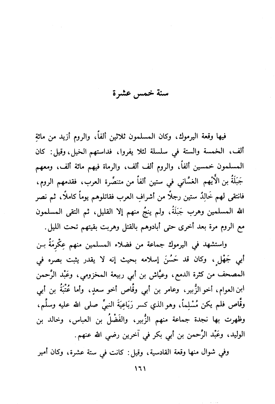 فيها وقعة اليرموك، وكان المسلمون ثلاثين ألفا، والروم أزيد من مائة ألف، الخمسة والستة في سلسلة لئلا يفروا، فداستهم الخيل، وقيل: كان المسلمون خمسين ألفا، والروم ألف ألف، والرماة فيهم مائة ألف، ومعهم جبلة بن الأيهم الغسّاني في ستين ألفا من متنصّرة العرب، فقدمهم الروم، فانتقى لهم خالد ستين رجلا من أشراف العرب فقاتلوهم يوما كاملا، ثم نصر الله المسلمين وهرب جبلة، ولم ينج منهم إلا القليل، ثم التقى المسلمون مع الروم مرة بعد أخرى حتى أبادوهم بالقتل وهربت بقيتهم تحت الليل.