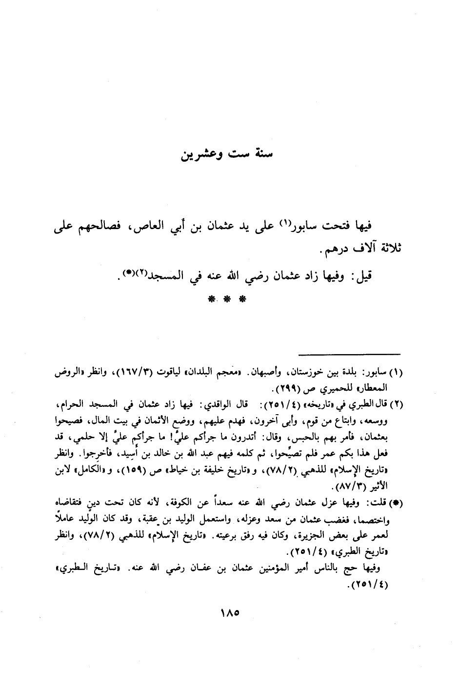 [3] قلت: وفيها عزل عثمان رضي الله عنه سعدا عن الكوفة، لأنه كان تحت دين فتقاضاه واختصما، فغضب عثمان من سعد وعزله، واستعمل الوليد بن عقبة، وقد كان الوليد عاملا لعمر على بعض الجزيرة، وكان فيه رفق برعيته. «تاريخ الإسلام» للذهبي (2/ 78) ، وانظر «تاريخ الطبري» (4/ 251) .