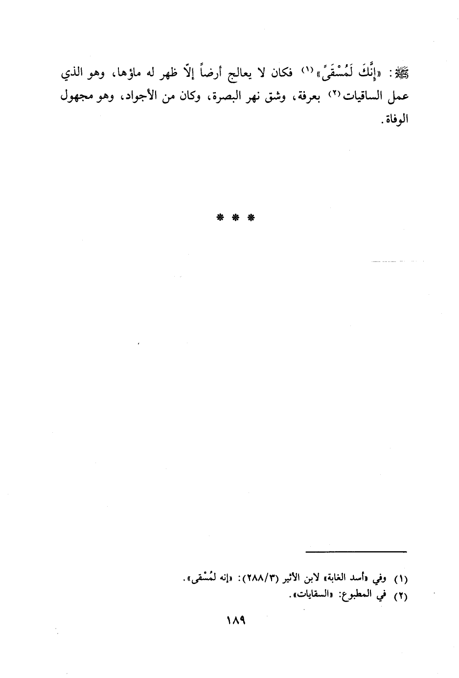 صلى الله عليه وسلم: «إنّك لمسقى» [1] فكان لا يعالج أرضا إلّا ظهر له ماؤها، وهو الذي عمل الساقيات [2] بعرفة، وشق نهر البصرة، وكان من الأجواد، وهو مجهول الوفاة.