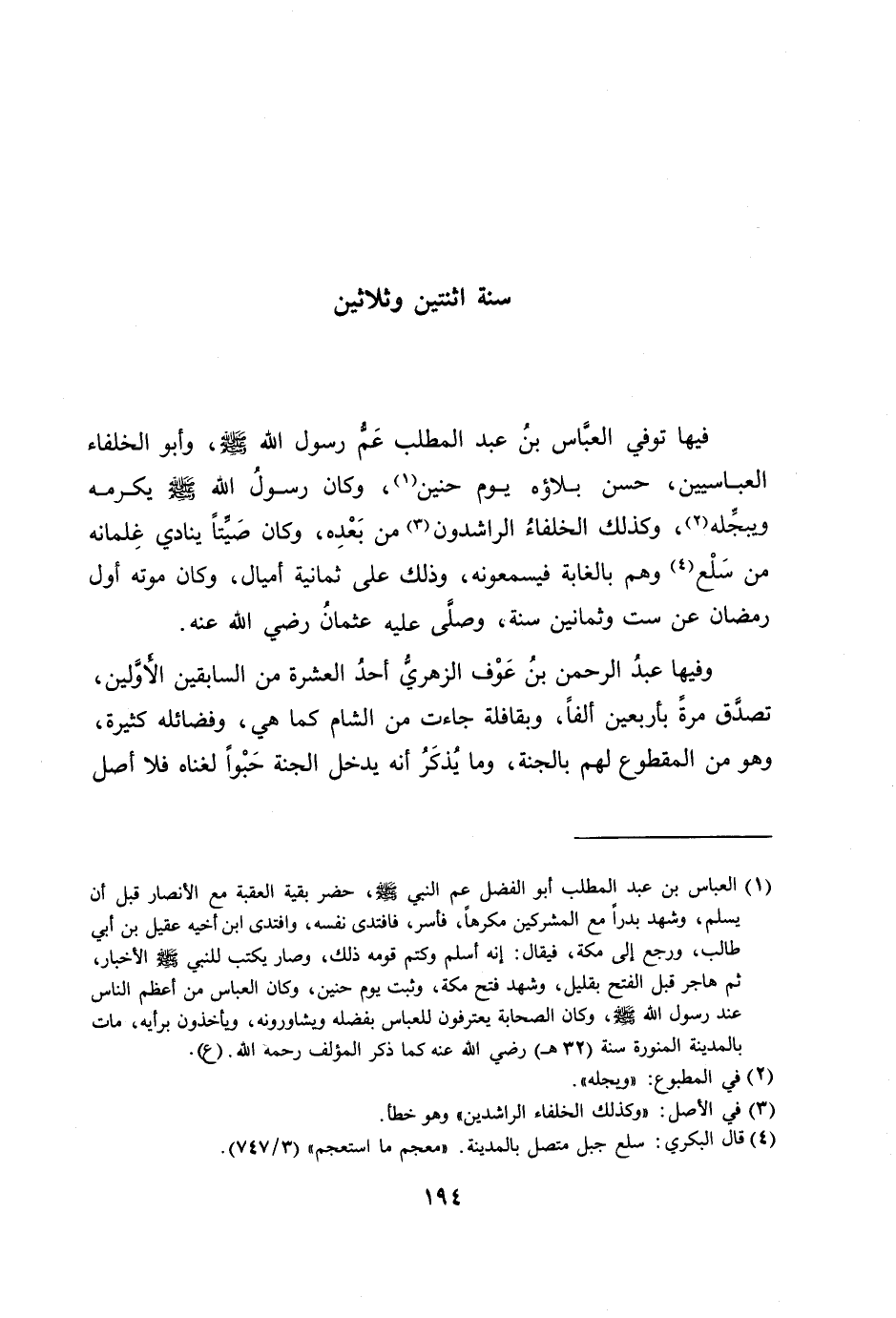 فيها توفي العبّاس بن عبد المطلب عمّ رسول الله صلى الله عليه وسلم، وأبو الخلفاء العباسيين، حسن بلاؤه يوم حنين [1] ، وكان رسول الله صلى الله عليه وسلم يكرمه ويبجّله [2] ، وكذلك الخلفاء الراشدون [3] من بعده، وكان صيّتا ينادي غلمانه من سلع [4] وهم بالغابة فيسمعونه، وذلك على ثمانية أميال، وكان موته أول رمضان عن ست وثمانين سنة، وصلّى عليه عثمان رضي الله عنه.