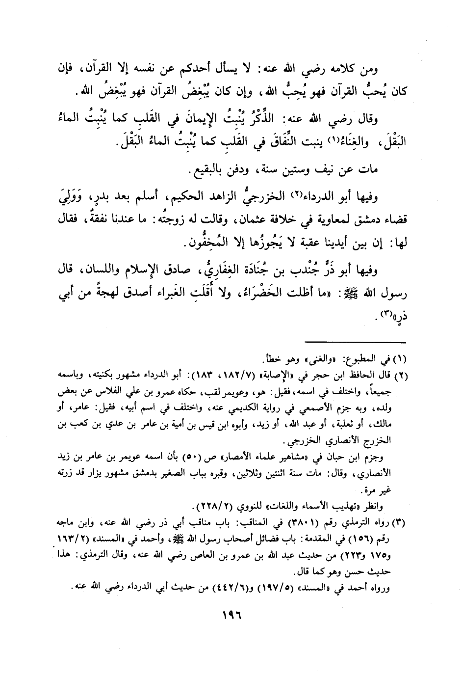 [2] قال الحافظ ابن حجر في «الإصابة» (7/ 182، 183) : أبو الدرداء مشهور بكنيته، وباسمه جميعا، واختلف في اسمه، فقيل: هو، وعويمر لقب، حكاه عمرو بن علي الفلاس عن بعض ولده، وبه جزم الأصمعي في رواية الكديمي عنه، واختلف في اسم أبيه، فقيل: عامر، أو مالك، أو ثعلبة، أو عبد الله، أو زيد، وأبوه ابن قيس بن أمية بن عامر بن عدي بن كعب بن الخزرج الأنصاري الخزرجي.