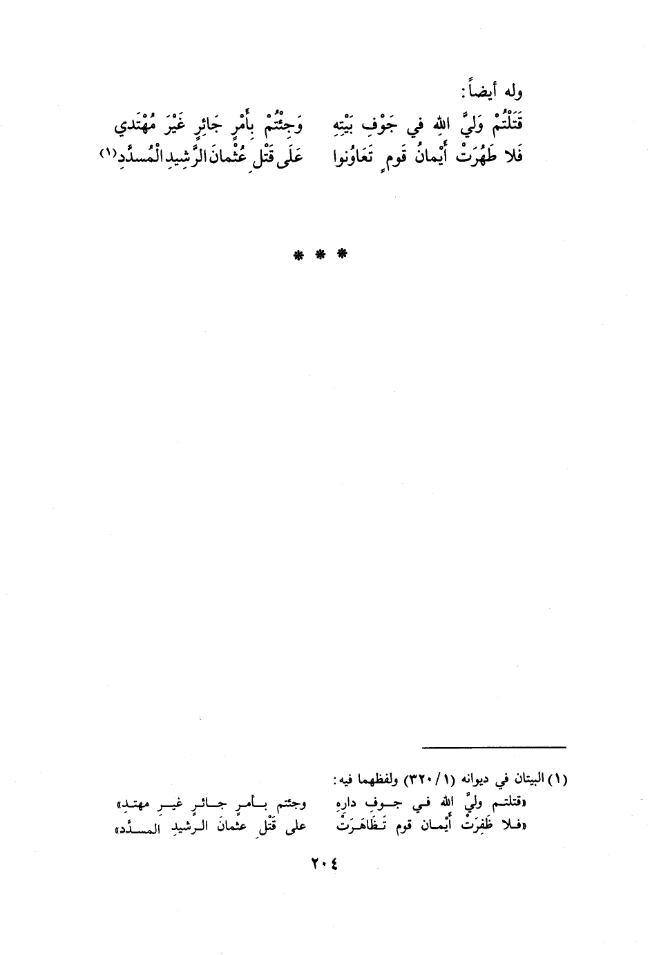 فلا طهرت أيمان قوم تعاونوا ... على قتل عثمان الرّشيد المسدّد [1]