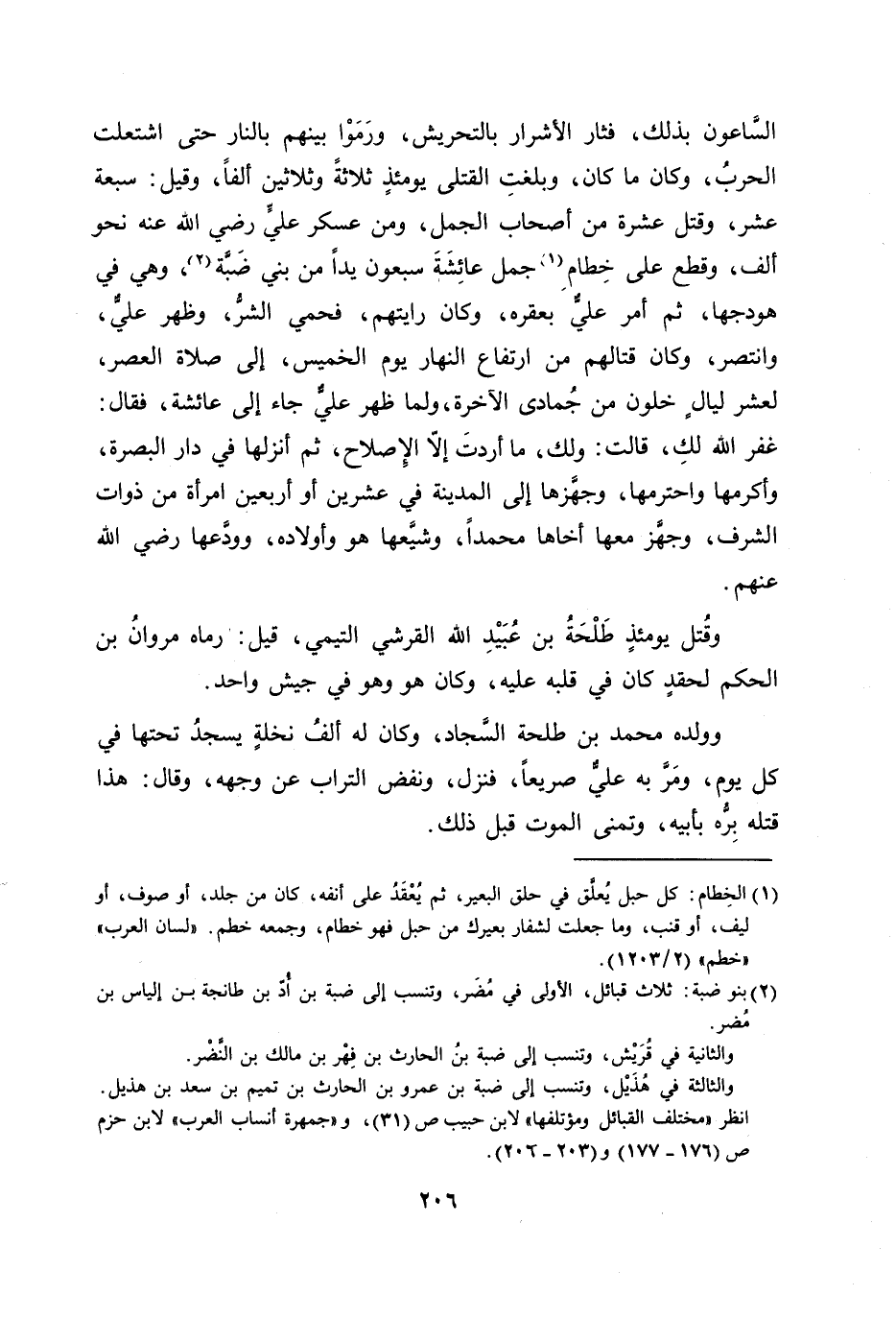 السّاعون بذلك، فثار الأشرار بالتحريش، ورموا بينهم بالنار حتى اشتعلت الحرب، وكان ما كان، وبلغت القتلى يومئذ ثلاثة وثلاثين ألفا، وقيل: سبعة عشر، وقتل عشرة من أصحاب الجمل، ومن عسكر عليّ رضي الله عنه نحو ألف، وقطع على خطام [1] جمل عائشة سبعون يدا من بني ضبّة [2] ، وهي في هودجها، ثم أمر عليّ بعقره، وكان رايتهم، فحمي الشرّ، وظهر عليّ، وانتصر، وكان قتالهم من ارتفاع النهار يوم الخميس، إلى صلاة العصر، لعشر ليال خلون من جمادى الآخرة، ولما ظهر عليّ جاء إلى عائشة، فقال: