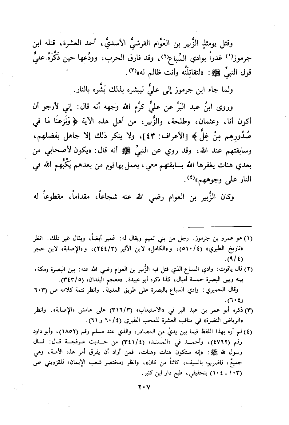 وقتل يومئذ الزّبير بن العوّام القرشيّ الأسديّ، أحد العشرة، قتله ابن جرموز [1] غدرا بوادي السّباع [2] ، وقد فارق الحرب، وودّعها حين ذكّره عليّ قول النبيّ صلى الله عليه وسلم: «لتقاتلنّه وأنت ظالم له» [3] . ولما جاء ابن جرموز إلى عليّ ليبشره بذلك بشّره بالنار.