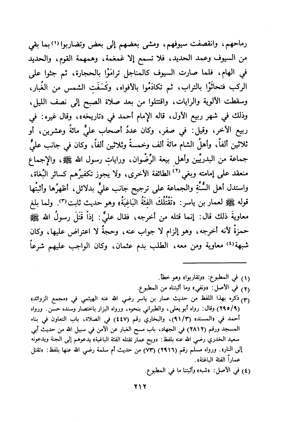 رماحهم، وانقصفت سيوفهم، ومشى بعضهم إلى بعض وتضاربوا [1] بما بقي من السيوف وعمد الحديد، فلا تسمع إلا غمغمة، وهمهمة القوم، والحديد في الهام، فلما صارت السيوف كالمناجل تراموا بالحجارة، ثم جثوا على الركب فتحاثوا بالتراب، ثم تكادموا بالأفواه، وكسفت الشمس من الغبار، وسقطت الألوية والرايات، واقتتلوا من بعد صلاة الصبح إلى نصف الليل، وذلك في شهر ربيع الأول، قاله الإمام أحمد في «تاريخه» ، وقال غيره: في ربيع الآخر، وقيل: في صفر، وكان عدد أصحاب عليّ مائة وعشرين، أو ثلاثين ألفا، وأهل الشام مائة ألف وخمسة وثلاثين ألفا، وكان في جانب عليّ جماعة من البدريّين وأهل بيعة الرّضوان، ورايات رسول الله صلى الله عليه وسلم، والإجماع منعقد على إمامته وبغي [2] الطائفة الأخرى، ولا يجوز تكفيرهم كسائر البغاة، واستدل أهل السّنّة والجماعة على ترجيح جانب عليّ بدلائل، أظهرها وأثبتها قوله صلى الله عليه وسلم لعمار بن ياسر: «تقتلك الفئة الباغية» وهو حديث ثابت [3] . ولما بلغ معاوية ذلك قال: إنما قتله من أخرجه، فقال عليّ: إذا قتل رسول الله صلى الله عليه وسلم حمزة لأنه أخرجه، وهو إلزام لا جواب عنه، وحجة لا اعتراض عليها، وكان شبهة [4] معاوية ومن معه، الطلب بدم عثمان، وكان الواجب عليهم شرعا