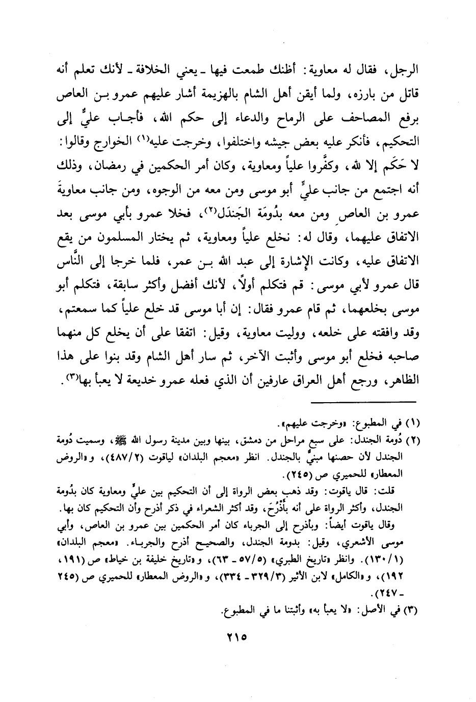 لا حكم إلا لله، وكفّروا عليا ومعاوية، وكان أمر الحكمين في رمضان، وذلك أنه اجتمع من جانب عليّ أبو موسى ومن معه من الوجوه، ومن جانب معاوية عمرو بن العاص ومن معه بدومة الجندل [2] ، فخلا عمرو بأبي موسى بعد الاتفاق عليهما، وقال له: نخلع عليا ومعاوية، ثم يختار المسلمون من يقع الاتفاق عليه، وكانت الإشارة إلى عبد الله بن عمر، فلما خرجا إلى النّاس قال عمرو لأبي موسى: قم فتكلم أولا، لأنك أفضل وأكثر سابقة، فتكلم أبو موسى بخلعهما، ثم قام عمرو فقال: إن أبا موسى قد خلع عليا كما سمعتم، وقد وافقته على خلعه، ووليت معاوية، وقيل: اتفقا على أن يخلع كل منهما صاحبه فخلع أبو موسى وأثبت الآخر، ثم سار أهل الشام وقد بنوا على هذا الظاهر، ورجع أهل العراق عارفين أن الذي فعله عمرو خديعة لا يعبأ بها [3] .