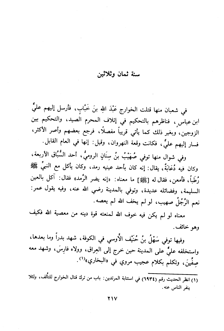 وفي شوال منها توفي صهيب بن سنان الروميّ، أحد السّبّاق الأربعة، وكان فيه دعابة، يقال: إنه كان بأحد عينيه رمد، وكان يأكل مع النبيّ صلى الله عليه وسلم رطبا، فأمعن، فقال له [صلى الله عليه وسلم] ما معناه: «إنه يضر الرّمد» فقال: آكل بالعين السليمة، وفضائله عديدة، وتوفي بالمدينة رضي الله عنه، وفيه يقول عمر: