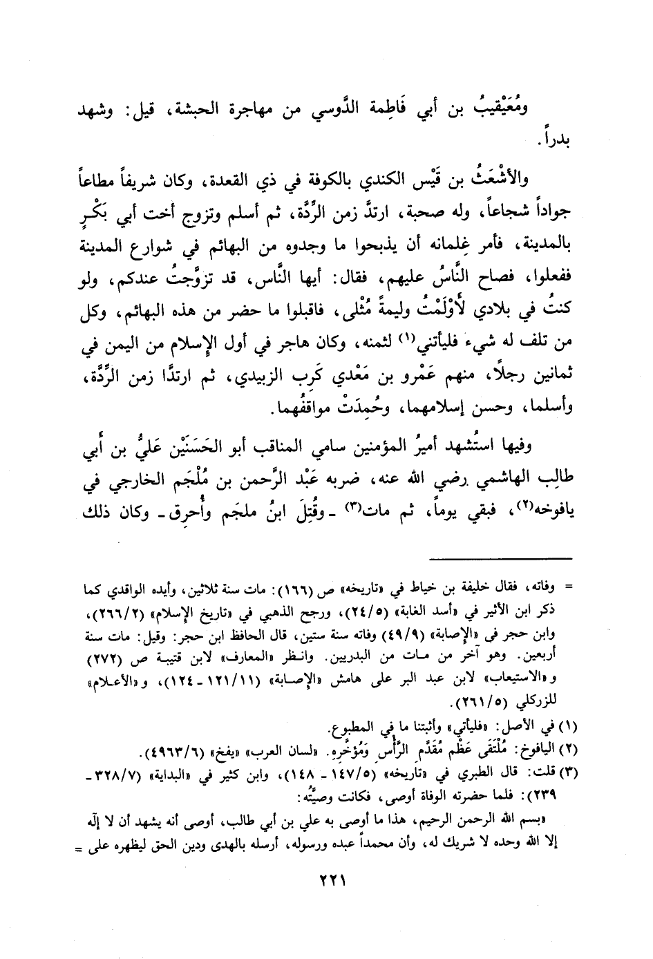 «بسم الله الرحمن الرحيم، هذا ما أوصى به علي بن أبي طالب، أوصى أنه يشهد أن لا إله إلا الله وحده لا شريك له، وأن محمدا عبده ورسوله، أرسله بالهدى ودين الحق ليظهره على