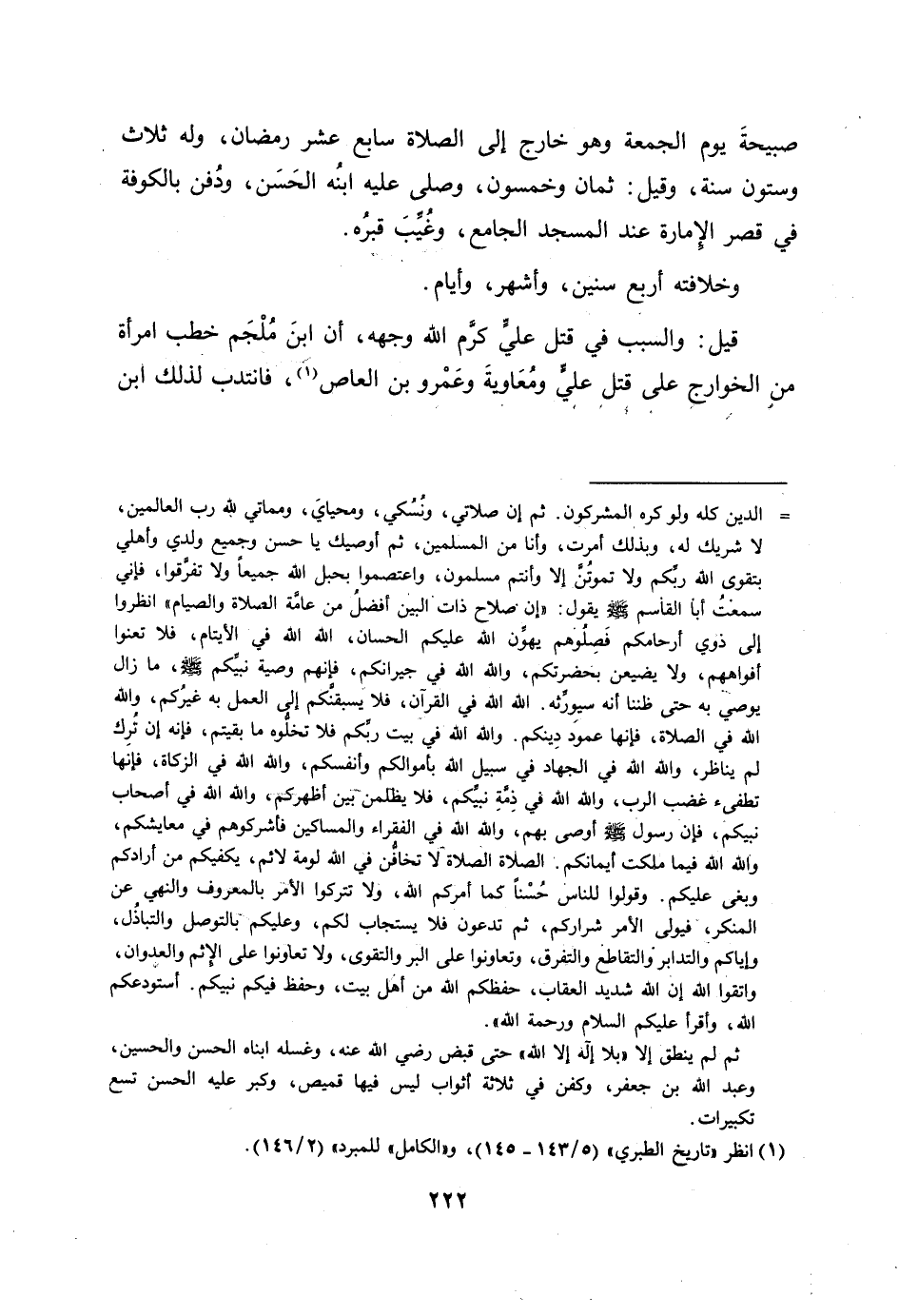 الدين كله ولو كره المشركون. ثم إن صلاتي، ونسكي، ومحياي، ومماتي لله رب العالمين، لا شريك له، وبذلك أمرت، وأنا من المسلمين، ثم أوصيك يا حسن وجميع ولدي وأهلي بتقوى الله ربّكم ولا تموتنّ إلا وأنتم مسلمون، واعتصموا بحبل الله جميعا ولا تفرّقوا، فإني سمعت أبا القاسم صلى الله عليه وسلم يقول: «إن صلاح ذات البين أفضل من عامّة الصلاة والصيام» انظروا إلى ذوي أرحامكم فصلوهم يهوّن الله عليكم الحسان، الله الله في الأيتام، فلا تعنوا أفواههم، ولا يضيعن بحضرتكم، والله الله في جيرانكم، فإنهم وصية نبيّكم صلى الله عليه وسلم، ما زال يوصي به حتى ظننا أنه سيورّثه. الله الله في القرآن، فلا يسبقنّكم إلى العمل به غيركم، والله الله في الصلاة، فإنها عمود دينكم. والله الله في بيت ربّكم فلا تخلّوه ما بقيتم، فإنه إن ترك لم يناظر، والله الله في الجهاد في سبيل الله بأموالكم وأنفسكم، والله الله في الزكاة، فإنها تطفئ غضب الرب، والله الله في ذمّة نبيّكم، فلا يظلمن بين أظهركم، والله الله في أصحاب نبيكم، فإن رسول الله صلى الله عليه وسلم أوصى بهم، والله الله في الفقراء والمساكين فأشركوهم في معايشكم، والله الله فيما ملكت أيمانكم. الصلاة الصلاة لا تخافّن في الله لومة لائم، يكفيكم من أرادكم وبغى عليكم. وقولوا للناس حسنا كما أمركم الله، ولا تتركوا الأمر بالمعروف والنهي عن المنكر، فيولى الأمر شراركم، ثم تدعون فلا يستجاب لكم، وعليكم بالتوصل والتباذل، وإياكم والتدابر والتقاطع والتفرق، وتعاونوا على البر والتقوى، ولا تعاونوا على الإثم والعدوان، واتقوا الله إن الله شديد العقاب، حفظكم الله من أهل بيت، وحفظ فيكم نبيكم. أستودعكم الله، وأقرأ عليكم السلام ورحمة الله» . ثم لم ينطق إلا «بلا إله إلا الله» حتى قبض رضي الله عنه، وغسله ابناه الحسن والحسين، وعبد الله بن جعفر، وكفن في ثلاثة أثواب ليس فيها قميص، وكبر عليه الحسن تسع تكبيرات.