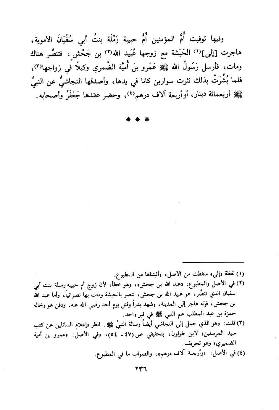 [2] في الأصل والمطبوع: «عبد الله بن جحش» ، وهو خطأ، لأن زوج أم حبيبة رملة بنت أبي سفيان الذي تنصّر، هو عبيد الله بن جحش، تنصر بالحبشة ومات بها نصرانيا، وأما عبد الله بن جحش، فإنه هاجر إلى المدينة، وشهد بدرا وقتل يوم أحد رضي الله عنه، ودفن هو وخاله حمزة بن عبد المطلب عم النبي صلى الله عليه وسلم في قبر واحد.