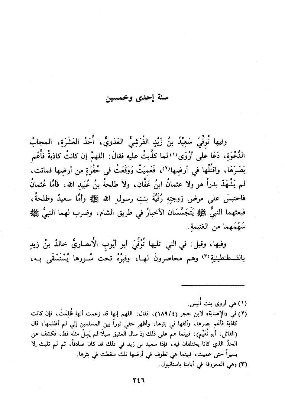 وفيها توفّي سعيد بن زيد القرشيّ العدويّ، أحد العشرة، المجاب الدّعوة، دعا على أروى [1] لما كذّبت عليه فقال: اللهمّ إن كانت كاذبة فأعم بصرها، واقتلها في أرضها [2] ، فعميت ووقعت في حفرة من أرضها فماتت، لم يشهد بدرا هو ولا عثمان ابن عفّان، ولا طلحة بن عبيد الله، فأمّا عثمان فاحتبس على مرض زوجته رقيّة بنت رسول الله صلى الله عليه وسلم وأمّا سعيد وطلحة، فبعثهما النبيّ صلى الله عليه وسلم يتجسّسان الأخبار في طريق الشام، وضرب لهما النبيّ صلى الله عليه وسلم سهمهما من الغنيمة.