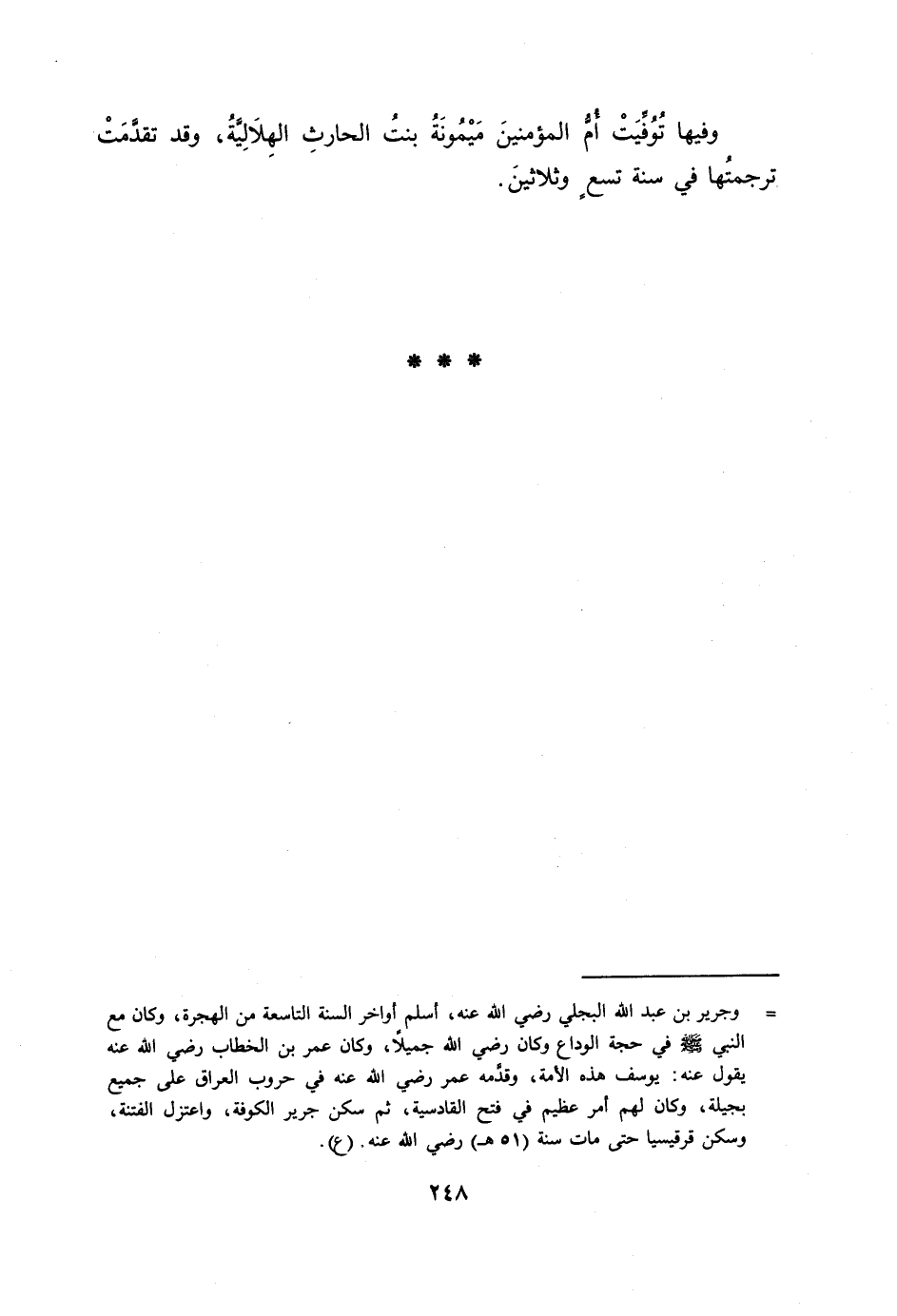 وجرير بن عبد الله البجلي رضي الله عنه، أسلم أواخر السنة التاسعة من الهجرة، وكان مع النبي صلى الله عليه وسلم في حجة الوداع وكان رضي الله جميلا، وكان عمر بن الخطاب رضي الله عنه يقول عنه: يوسف هذه الأمة، وقدّمه عمر رضي الله عنه في حروب العراق على جميع بجيلة، وكان لهم أمر عظيم في فتح القادسية، ثم سكن جرير الكوفة، واعتزل الفتنة، وسكن قرقيسيا حتى مات سنة (51 هـ) رضي الله عنه. (ع) .