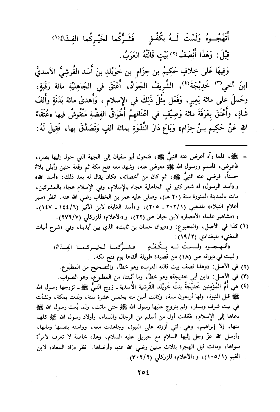 وفيها على خلاف حكيم بن حزام بن خويلد بن أسد القرشيّ الأسديّ ابن أخي [3] خديجة [4] ، الشّريف الجواد، أعتق في الجاهليّة مائة رقبة، وحمل على مائة بعير، وفعل مثل ذلك في الإسلام، وأهدى مائة بدنة وألف شاة، وأعتق بعرفة مائة وصيف في أعناقهم أطواق الفضّة منقوش فيها «عتقاء الله عن حكيم بن حزام» وباع دار النّدوة بمائة ألف وتصدّق بها، فقيل له: