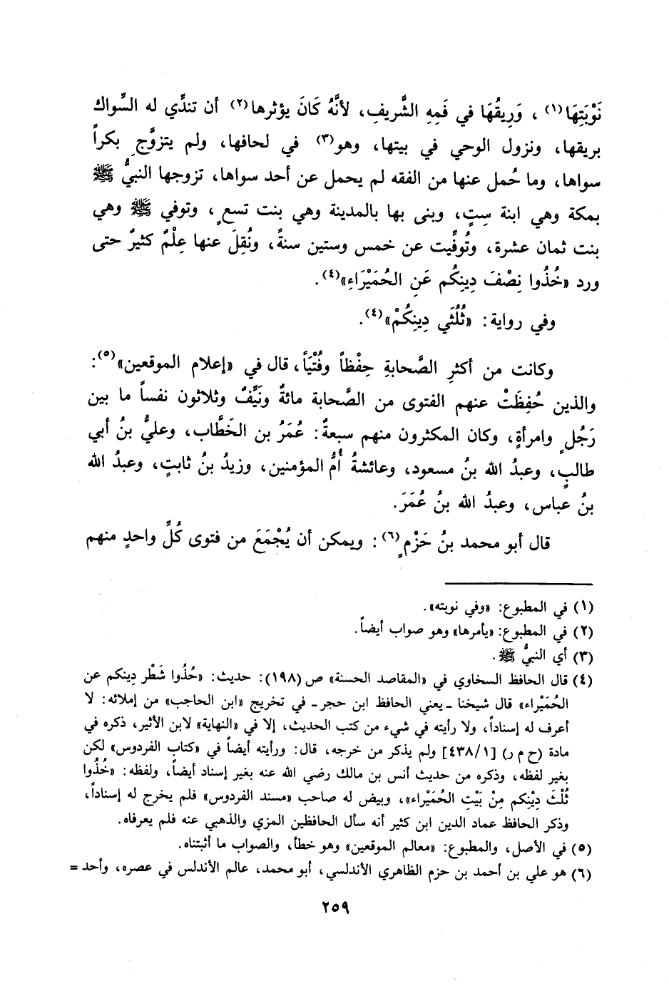 [4] قال الحافظ السخاوي في «المقاصد الحسنة» ص (198) : حديث: «حذوا شطر دينكم عن الحميراء» قال شيخنا- يعني الحافظ ابن حجر- في تخريج «ابن الحاجب» من إملائه: لا أعرف له إسنادا، ولا رأيته في شيء من كتب الحديث، إلا في «النهاية» لابن الأثير، ذكره في مادة (ح م ر) [1/ 438] ولم يذكر من خرجه، قال: ورأيته أيضا في «كتاب الفردوس» لكن بغير لفظه، وذكره من حديث أنس بن مالك رضي الله عنه بغير إسناد أيضا، ولفظه: «خذوا ثلث دينكم من بيت الحميراء» ، وبيض له صاحب «مسند الفردوس» فلم يخرج له إسنادا، وذكر الحافظ عماد الدين ابن كثير أنه سأل الحافظين المزي والذهبي عنه فلم يعرفاه.