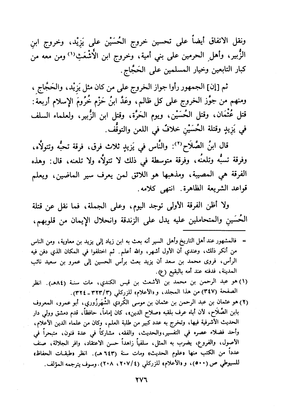 ونقل الاتفاق أيضا على تحسين خروج الحسين على يزيد، وخروج ابن الزّبير، وأهل الحرمين على بني أمية، وخروج ابن الأشعث [1] ومن معه من كبار التابعين وخيار المسلمين على الحجّاج.