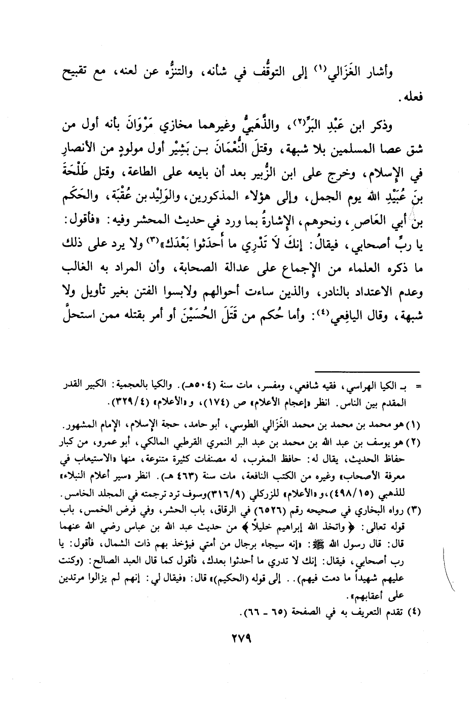 يا ربّ أصحابي، فيقال: إنك لا تدري ما أحدثوا بعدك» [3] ولا يرد على ذلك ما ذكره العلماء من الإجماع على عدالة الصحابة، وأن المراد به الغالب وعدم الاعتداد بالنادر، والذين ساءت أحوالهم ولابسوا الفتن بغير تأويل ولا شبهة، وقال اليافعي [4] : وأما حكم من قتل الحسين أو أمر بقتله ممن استحلّ