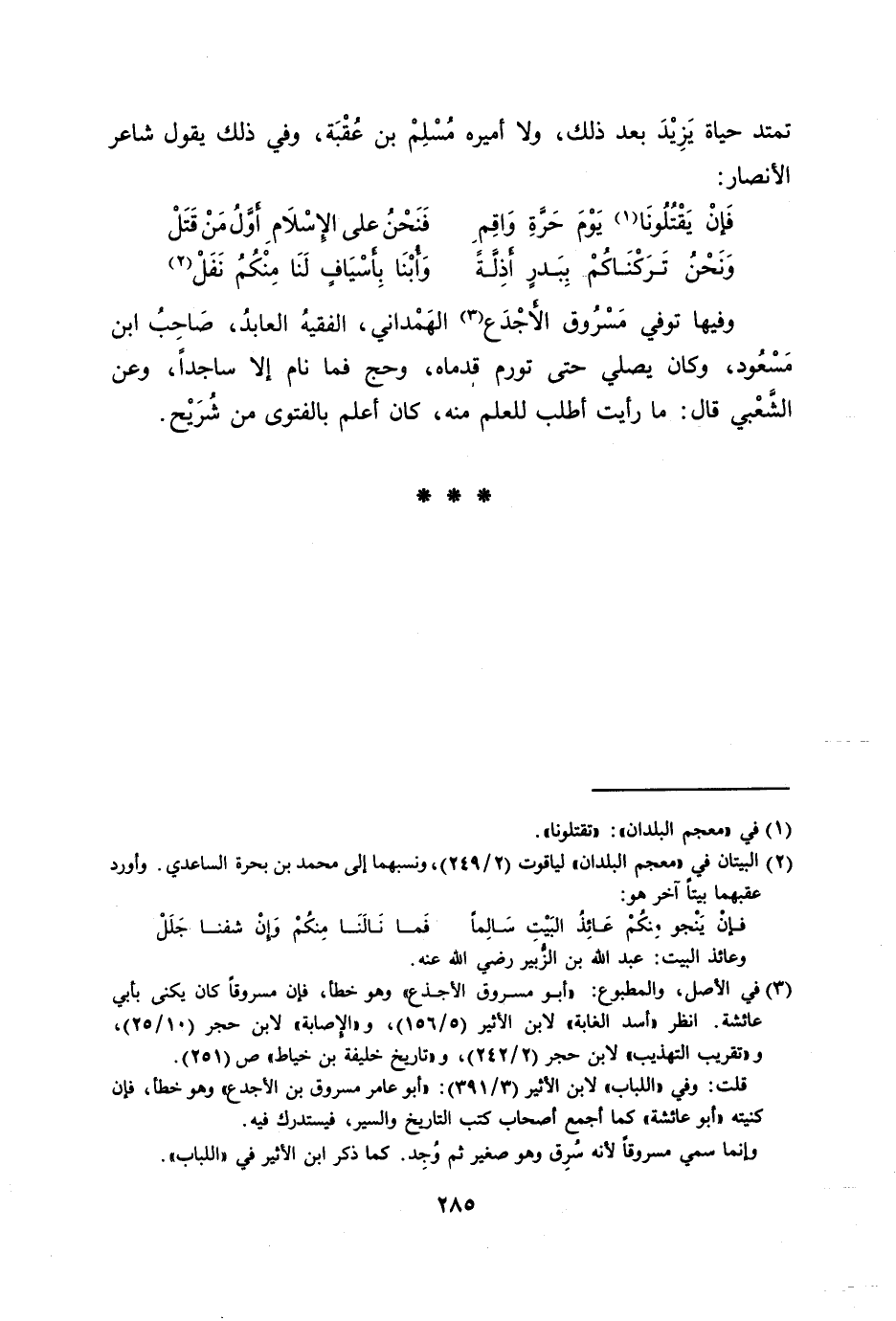 قلت: وفي «اللباب» لابن الأثير (3/ 391) : «أبو عامر مسروق بن الأجدع» وهو خطأ، فإن كنيته «أبو عائشة» كما أجمع أصحاب كتب التاريخ والسير، فيستدرك فيه.