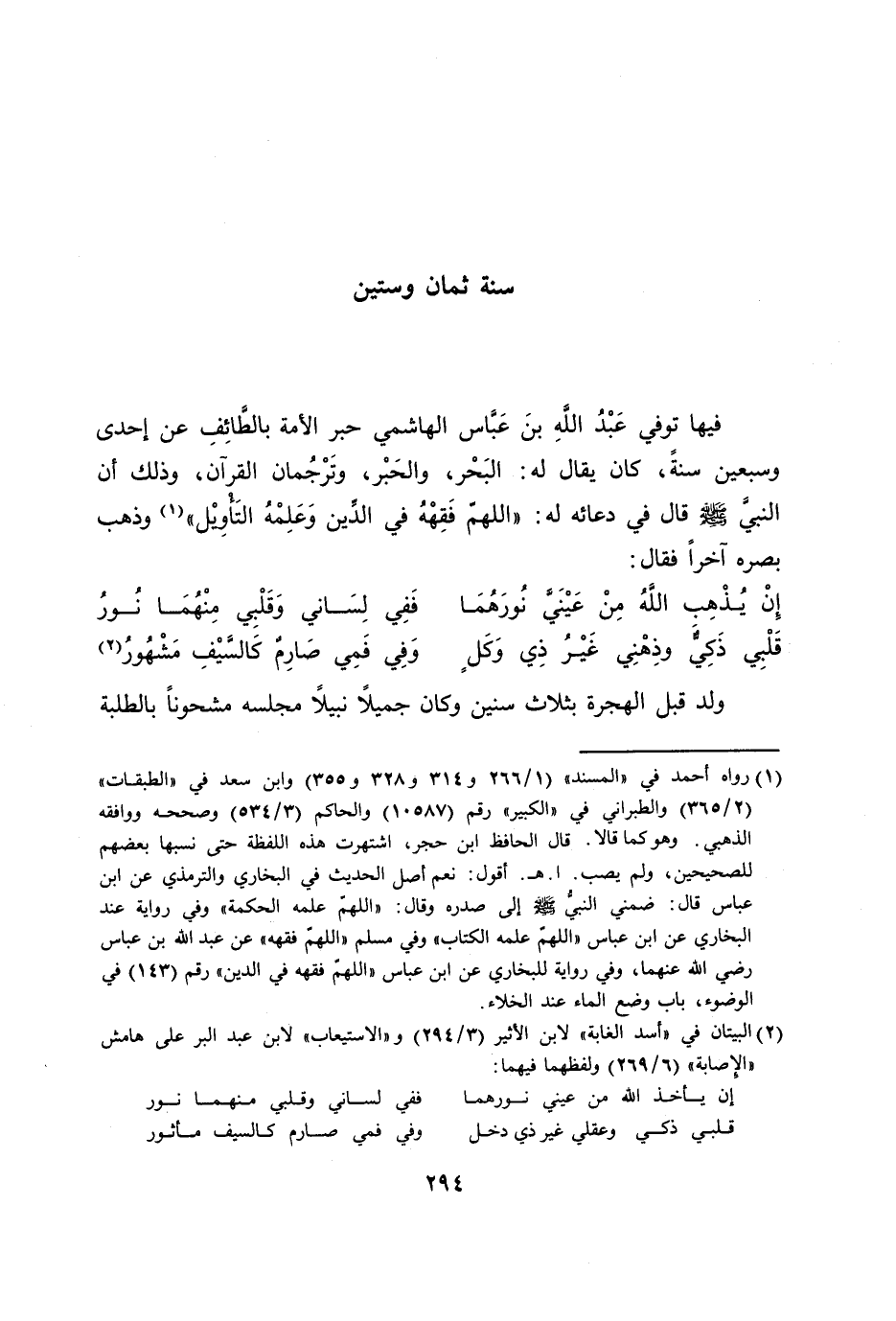 [1] رواه أحمد في «المسند» (1/ 266 و 314 و 328 و 355) وابن سعد في «الطبقات» (2/ 365) والطبراني في «الكبير» رقم (10587) والحاكم (3/ 534) وصححه ووافقه الذهبي. وهو كما قالا. قال الحافظ ابن حجر، اشتهرت هذه اللفظة حتى نسبها بعضهم للصحيحين، ولم يصب. ا. هـ. أقول: نعم أصل الحديث في البخاري والترمذي عن ابن عباس قال: ضمني النبيّ صلى الله عليه وسلم إلى صدره وقال: «اللهمّ علمه الحكمة» وفي رواية عند البخاري عن ابن عباس «اللهمّ علمه الكتاب» وفي مسلم «اللهمّ فقهه» عن عبد الله بن عباس رضي الله عنهما، وفي رواية للبخاري عن ابن عباس «اللهمّ فقهه في الدين» رقم (143) في الوضوء، باب وضع الماء عند الخلاء.