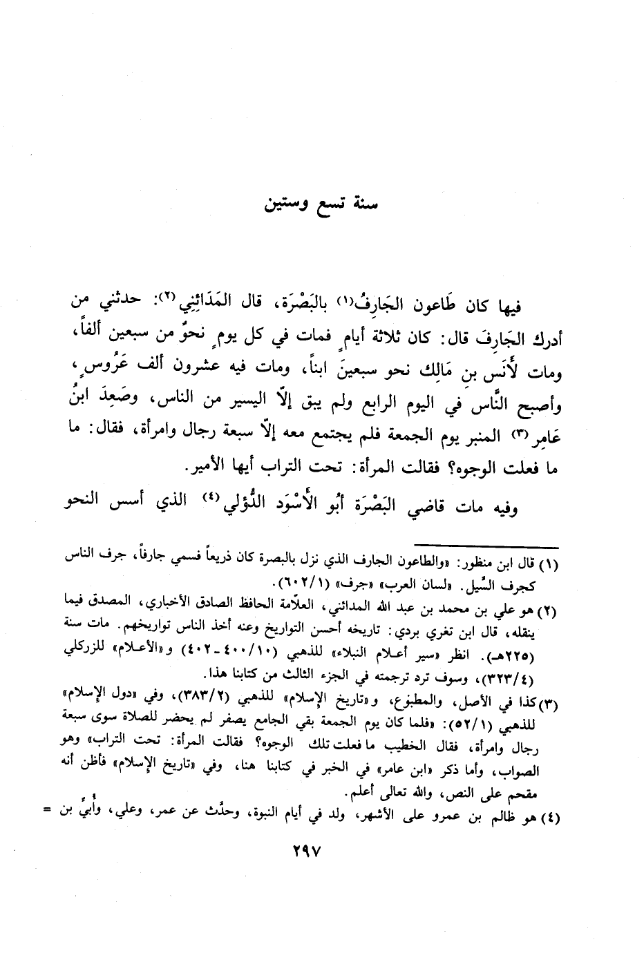 [1] قال ابن منظور: «والطاعون الجارف الذي نزل بالبصرة كان ذريعا فسمي جارفا، جرف الناس كجرف السّيل. «لسان العرب» «جرف» (1/ 602) .
