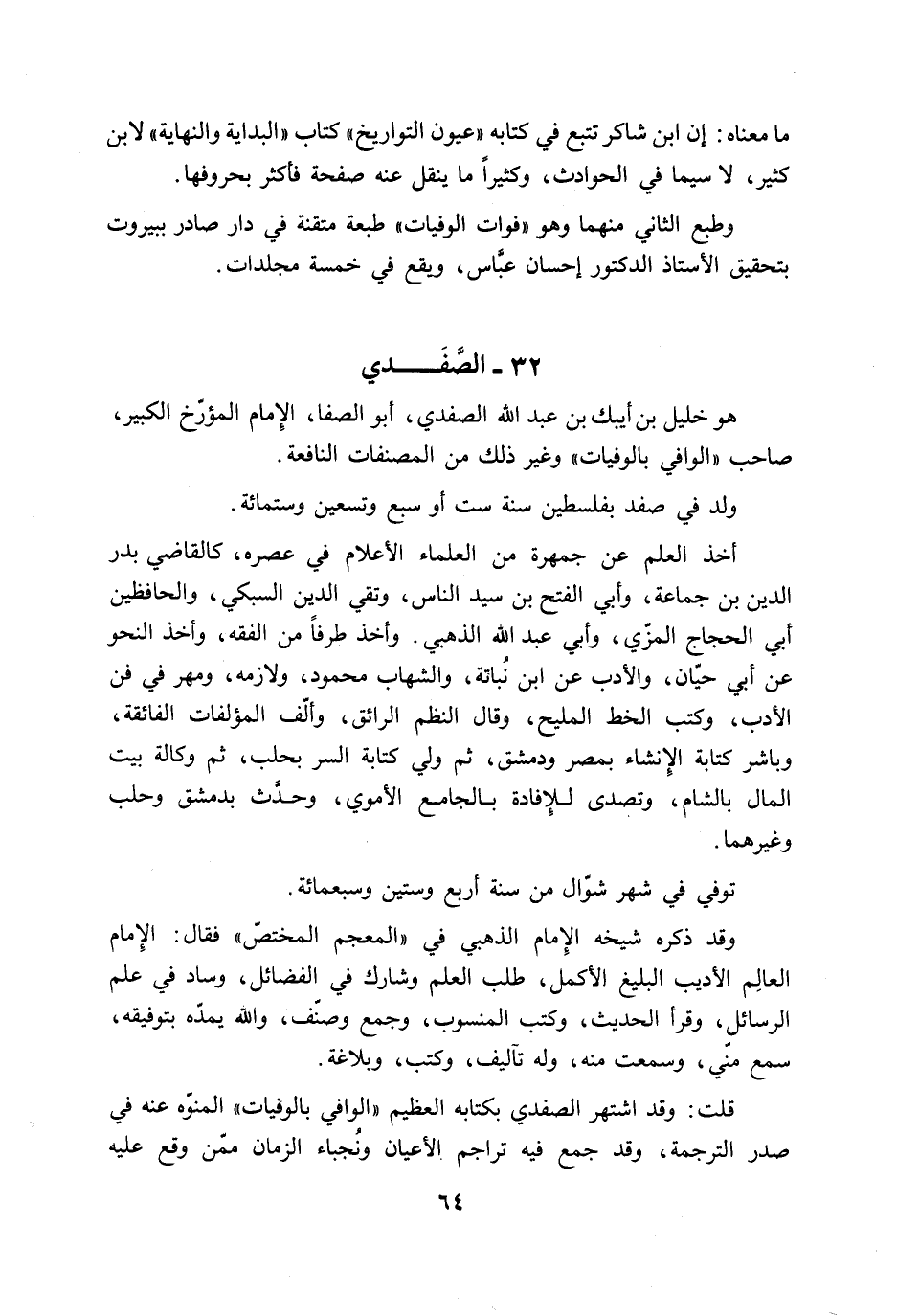 قلت: وقد اشتهر الصفدي بكتابه العظيم «الوافي بالوفيات» المنوّه عنه في صدر الترجمة، وقد جمع فيه تراجم الأعيان ونجباء الزمان ممّن وقع عليه
