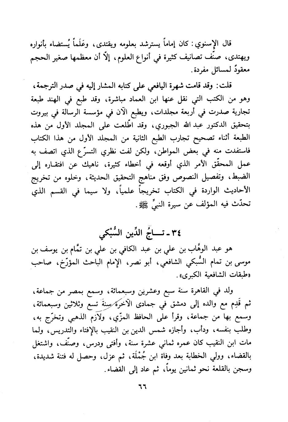 قلت: وقد قامت شهرة اليافعي على كتابه المشار إليه في صدر الترجمة، وهو من الكتب التي نقل عنها ابن العماد مباشرة، وقد طبع في الهند طبعة تجارية صدرت في أربعة مجلدات، ويطبع الآن في مؤسسة الرسالة في بيروت بتحقيق الدكتور عبد الله الجبوري، وقد اطّلعت على المجلد الأول من هذه الطبعة أثناء تصحيح تجارب الطبع الثانية من المجلد الأول من هذا الكتاب فاستفدت منه في بعض المواطن، ولكن لفت نظري التسرّع الذي اتصف به عمل المحقّق الأمر الذي أوقعه في أخطاء كثيرة، ناهيك عن افتقاره إلى الضبط، وتفصيل النصوص وفق مناهج التحقيق الحديثة، وخلوه من تخريج الأحاديث الواردة في الكتاب تخريجا علميا، ولا سيما في القسم الذي تحدّث فيه المؤلف عن سيرة النبيّ صلى الله عليه وسلم.