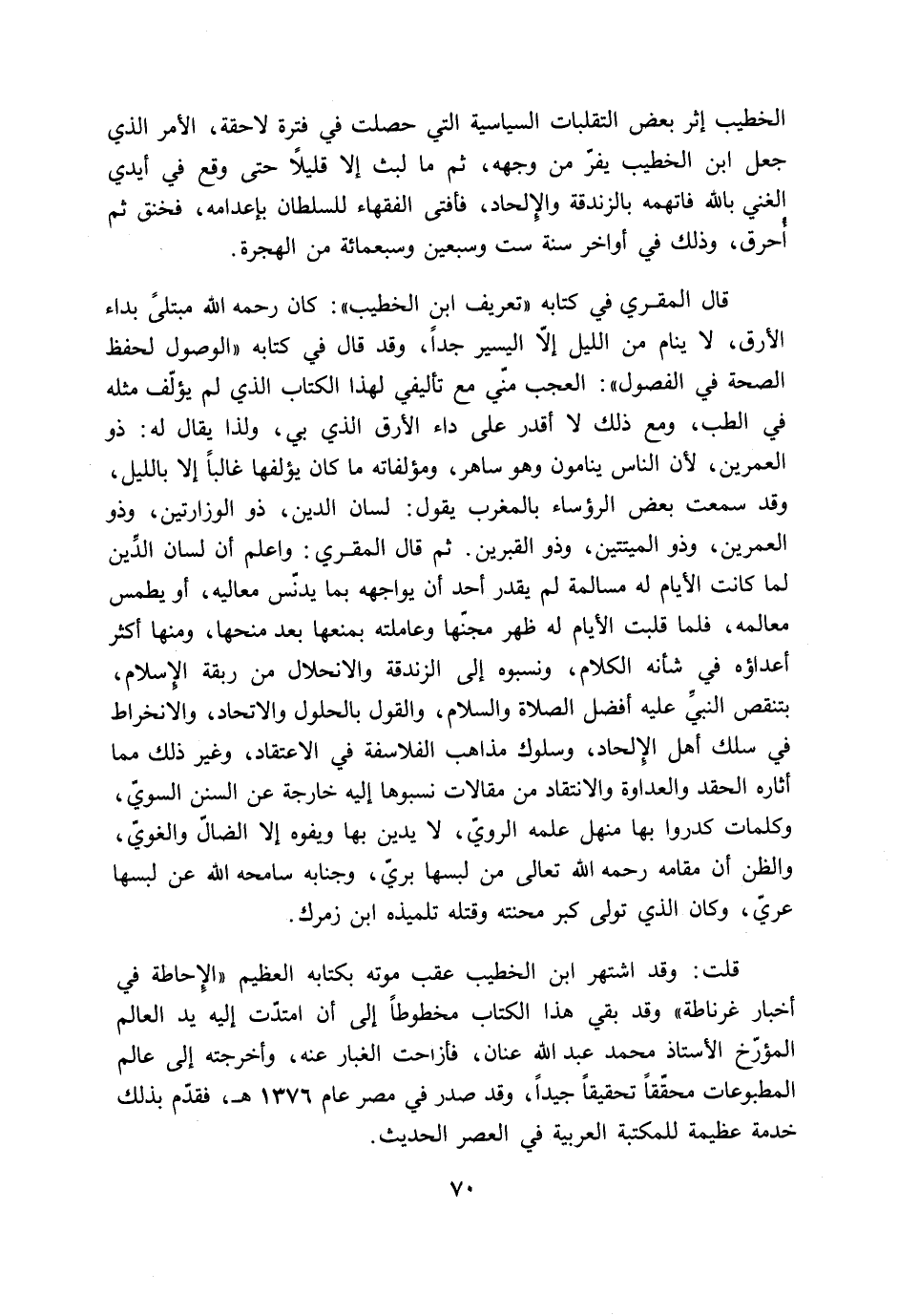 قلت: وقد اشتهر ابن الخطيب عقب موته بكتابه العظيم «الإحاطة في أخبار غرناطة» وقد بقي هذا الكتاب مخطوطا إلى أن امتدّت إليه يد العالم المؤرّخ الأستاذ محمد عبد الله عنان، فأزاحت الغبار عنه، وأخرجته إلى عالم المطبوعات محقّقا تحقيقا جيدا، وقد صدر في مصر عام 1376 هـ، فقدّم بذلك خدمة عظيمة للمكتبة العربية في العصر الحديث