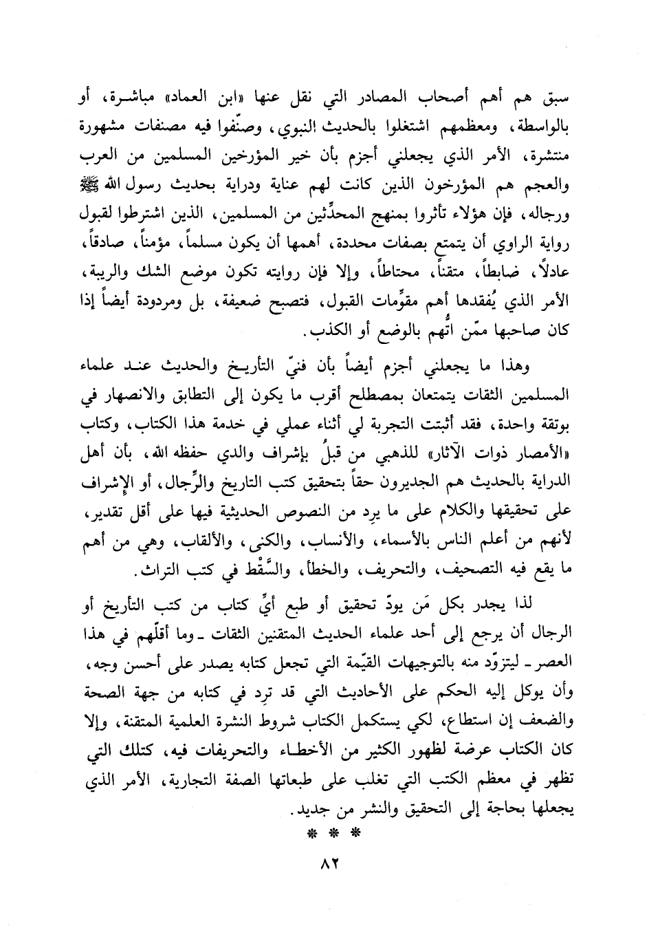 وهذا ما يجعلني أجزم أيضا بأن فنيّ التأريخ والحديث عند علماء المسلمين الثقات يتمتعان بمصطلح أقرب ما يكون إلى التطابق والانصهار في بوتقة واحدة، فقد أثبتت التجربة لي أثناء عملي في خدمة هذا الكتاب، وكتاب «الأمصار ذوات الآثار» للذهبي من قبل بإشراف والدي حفظه الله، بأن أهل الدراية بالحديث هم الجديرون حقا بتحقيق كتب التاريخ والرّجال، أو الإشراف على تحقيقها والكلام على ما يرد من النصوص الحديثية فيها على أقل تقدير، لأنهم من أعلم الناس بالأسماء، والأنساب، والكنى، والألقاب، وهي من أهم ما يقع فيه التصحيف، والتحريف، والخطأ، والسّقط في كتب التراث.