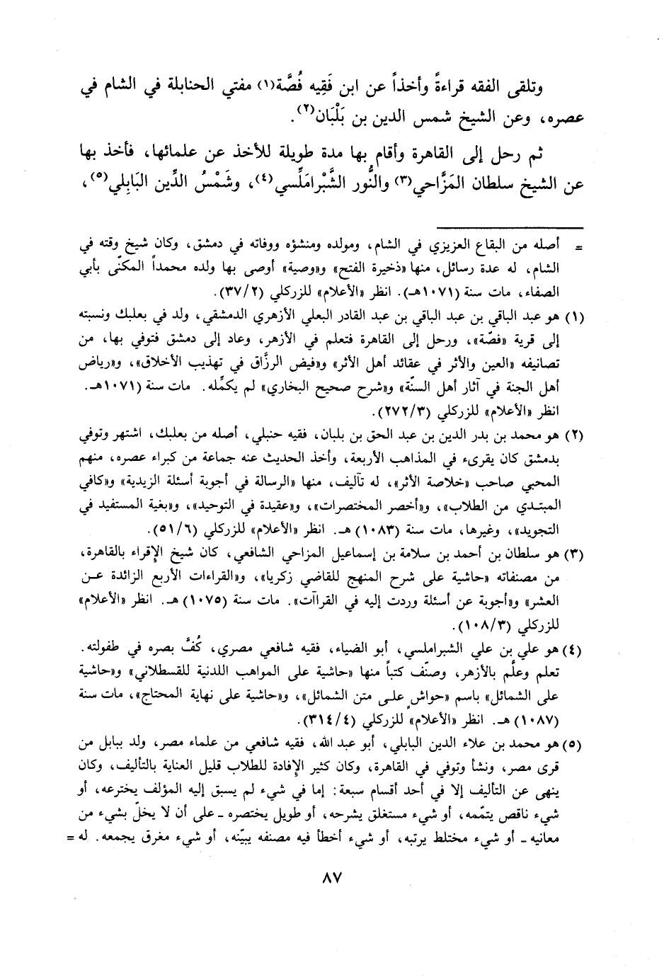 [2] هو محمد بن بدر الدين بن عبد الحق بن بلبان، فقيه حنبلي، أصله من بعلبك، اشتهر وتوفي بدمشق كان يقرئ في المذاهب الأربعة، وأخذ الحديث عنه جماعة من كبراء عصره، منهم المحبي صاحب «خلاصة الأثر» ، له تآليف، منها «الرسالة في أجوبة أسئلة الزيدية» و «كافي المبتدي من الطلاب» ، و «أخصر المختصرات» ، و «عقيدة في التوحيد» ، و «بغية المستفيد في التجويد» ، وغيرها، مات سنة (1083) هـ. انظر «الأعلام» للزركلي (6/ 51) .