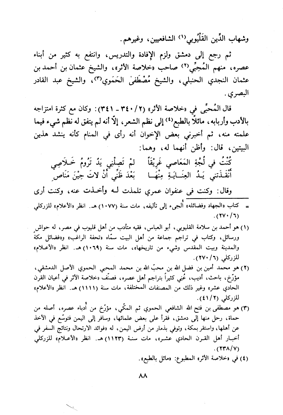 [2] هو محمد أمين بن فضل الله بن محبّ الله بن محمد المحبي الحموي الأصل الدمشقي، مؤرّخ، باحث، أديب، عني كثيرا بتراجم أهل عصره، فصنّف «خلاصة الأثر في أعيان القرن الحادي عشر» وغير ذلك من المصنفات المختلفة، مات سنة (1111) هـ. انظر «الأعلام» للزركلي (2/ 41) .