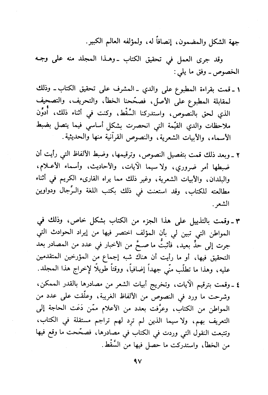 2- وبعد ذلك قمت بتفصيل النصوص، وترقيمها، وضبط الألفاظ التي رأيت أن ضبطها أمر ضروري، ولا سيما الآيات، والأحاديث، وأسماء الأعلام، والبلدان، والأبيات الشعرية، وغير ذلك مما يراه القارئ الكريم في أثناء مطالعته للكتاب، وقد استعنت في ذلك بكتب اللغة والرّجال ودواوين الشعر.