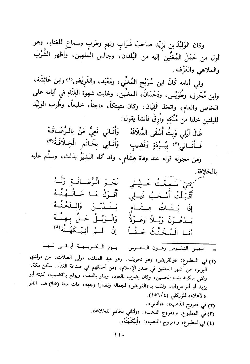 [1] في المطبوع: «والقريض» وهو تحريف. وهو عبد الملك، مولى العبلات، من مولدي البربر، من أشهر المغنين في صدر الإسلام، ومن أحذقهم في صناعة الغناء. سكن مكة، وغنى سكينة بنت الحسين، وكان يضرب بالعود، وينقر بالدف، ويوقع بالقضيب، كنيته أبو يزيد أو أبو مروان، ولقب ب «الغريض» لجماله ونضارة وجهه، مات سنة (95) هـ. انظر «الأعلام» للزركلي (4/ 156) .