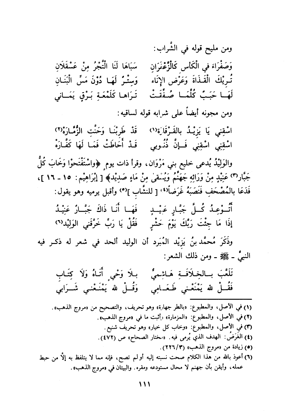 [6] أعوذ بالله من هذا الكلام صحت نسبته إليه أو لم تصح، فإنه مما لا يتلفظ به إلّا من حبط عمله، وأيقن بأن جهنم لا محال مستودعه ومقره. والبيتان في «مروج الذهب» .