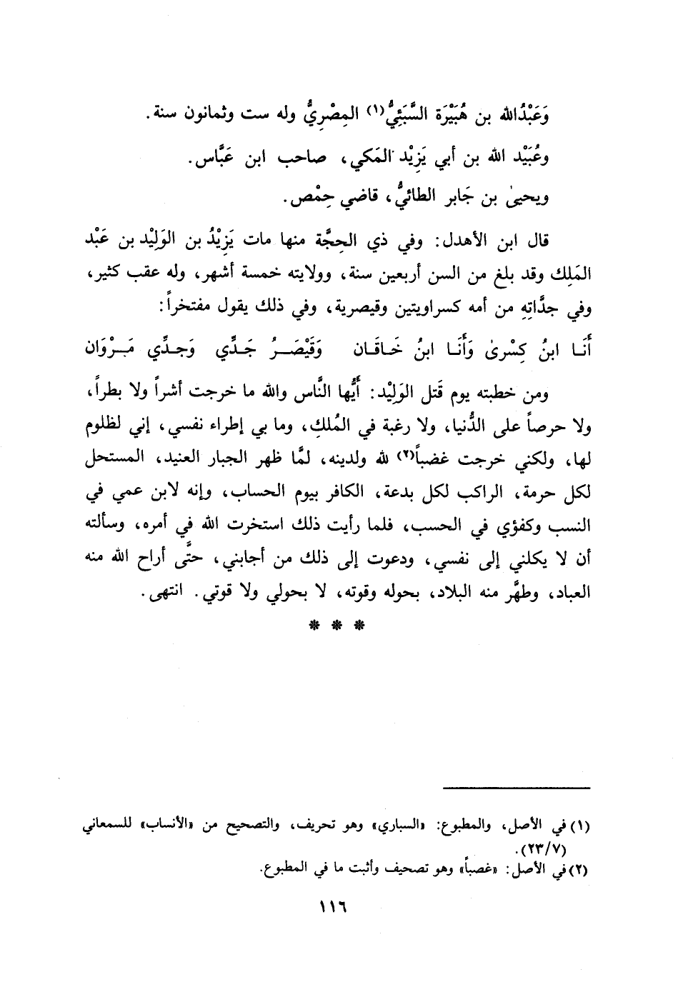 ومن خطبته يوم قتل الوليد: أيّها النّاس والله ما خرجت أشرا ولا بطرا، ولا حرصا على الدّنيا، ولا رغبة في الملك، وما بي إطراء نفسي، إني لظلوم لها، ولكني خرجت غضبا [2] لله ولدينه، لمّا ظهر الجبار العنيد، المستحل لكل حرمة، الراكب لكل بدعة، الكافر بيوم الحساب، وإنه لابن عمي في النسب وكفؤي في الحسب، فلما رأيت ذلك استخرت الله في أمره، وسألته أن لا يكلني إلى نفسي، ودعوت إلى ذلك من أجابني، حتّى أراح الله منه العباد، وطهّر منه البلاد، بحوله وقوته، لا بحولي ولا قوتي. انتهى.