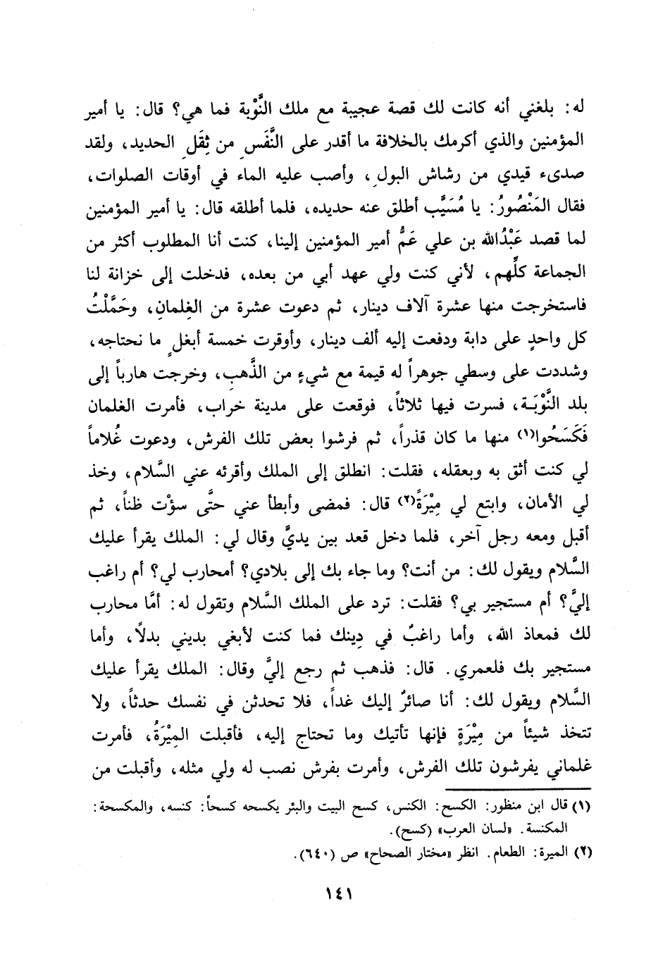 له: بلغني أنه كانت لك قصة عجيبة مع ملك النّوبة فما هي؟ قال: يا أمير المؤمنين والذي أكرمك بالخلافة ما أقدر على النّفس من ثقل الحديد، ولقد صدئ قيدي من رشاش البول، وأصب عليه الماء في أوقات الصلوات، فقال المنصور: يا مسيّب أطلق عنه حديده، فلما أطلقه قال: يا أمير المؤمنين لما قصد عبد الله بن علي عمّ أمير المؤمنين إلينا، كنت أنا المطلوب أكثر من الجماعة كلّهم، لأني كنت ولي عهد أبي من بعده، فدخلت إلى خزانة لنا فاستخرجت منها عشرة آلاف دينار، ثم دعوت عشرة من الغلمان، وحمّلت كل واحد على دابة ودفعت إليه ألف دينار، وأوقرت خمسة أبغل ما نحتاجه، وشددت على وسطي جوهرا له قيمة مع شيء من الذّهب، وخرجت هاربا إلى بلد النّوبة، فسرت فيها ثلاثا، فوقعت على مدينة خراب، فأمرت الغلمان فكسحوا [1] منها ما كان قذرا، ثم فرشوا بعض تلك الفرش، ودعوت غلاما لي كنت أثق به وبعقله، فقلت: انطلق إلى الملك وأقرئه عني السّلام، وخذ لي الأمان، وابتع لي ميرة [2] قال: فمضى وأبطأ عني حتّى سؤت ظنا، ثم أقبل ومعه رجل آخر، فلما دخل قعد بين يديّ وقال لي: الملك يقرأ عليك السّلام ويقول لك: من أنت؟ وما جاء بك إلى بلادي؟ أمحارب لي؟ أم راغب إليّ؟ أم مستجير بي؟ فقلت: ترد على الملك السّلام وتقول له: أمّا محارب لك فمعاذ الله، وأما راغب في دينك فما كنت لأبغي بديني بدلا، وأما مستجير بك فلعمري. قال: فذهب ثم رجع إليّ وقال: الملك يقرأ عليك السّلام ويقول لك: أنا صائر إليك غدا، فلا تحدثن في نفسك حدثا، ولا تتخذ شيئا من ميرة فإنها تأتيك وما تحتاج إليه، فأقبلت الميرة، فأمرت غلماني يفرشون تلك الفرش، وأمرت بفرش نصب له ولي مثله، وأقبلت من