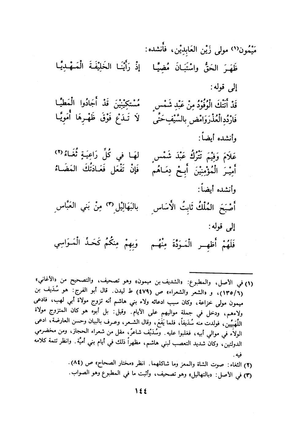 [1] في الأصل، والمطبوع: «الشديف بن ميمون» وهو تصحيف، والتصحيح من «الأغاني» (6/ 135) ، و «الشعر والشعراء» ص (479) ط ليدن. قال أبو الفرج: هو سديف بن ميمون مولى خزاعة، وكان سبب ادعائه ولاء بني هاشم أنه تزوج مولاة أبي لهب، فادعى ولاءهم، ودخل في جملة مواليهم على الأيام. وقيل: بل أبوه هو كان المتزوج مولاة اللهبيّين، فولدت منه سديفا، فلما يفع، وقال الشعر، وعرف بالبيان وحسن العارضة، ادعى الولاء في موالي أبيه، فغلبوا عليه. وسديف شاعر، مقل من شعراء الحجاز، ومن مخضرمي الدولتين، وكان شديد التعصب لبني هاشم، مظهرا ذلك في أيام بني أميّة. وانظر تتمة كلامه فيه.
