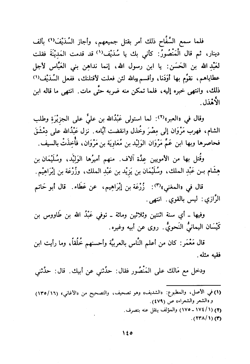 فلما سمع السّفّاح ذلك أمر بقتل جميعهم، وأجاز السديف [1] بألف دينار، ثم قال المنصور: كأني بك يا سديف [1] قد قدمت المدينة فقلت لعبد الله بن الحسن: يا ابن رسول الله، إنما نداهن بني العبّاس لأجل عطاياهم، نقوّم بها أودنا، وأقسم بالله لئن فعلت لأقتلنك، ففعل السديف [1] ذلك، وانتهى خبره إليه، فلما تمكن منه ضربه حتّى مات. انتهى ما قاله ابن الأهدل.