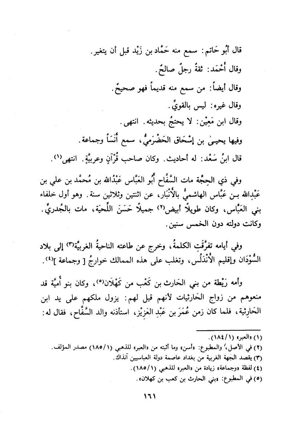 [4] لفظة «وجماعة» زيادة من «العبر» للذهبي (1/ 185) .