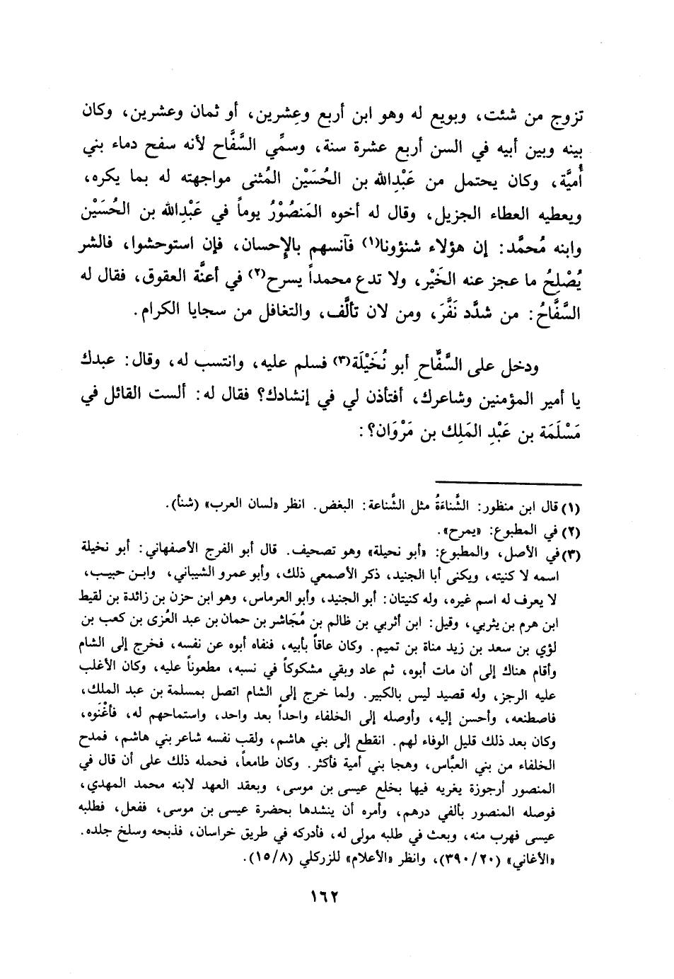 تزوج من شئت، وبويع له وهو ابن أربع وعشرين، أو ثمان وعشرين، وكان بينه وبين أبيه في السن أربع عشرة سنة، وسمّي السّفّاح لأنه سفح دماء بني أميّة، وكان يحتمل من عبد الله بن الحسين المثنى مواجهته له بما يكره، ويعطيه العطاء الجزيل، وقال له أخوه المنصور يوما في عبد الله بن الحسين وابنه محمّد: إن هؤلاء شنئونا [1] فآنسهم بالإحسان، فإن استوحشوا، فالشر يصلح ما عجز عنه الخير، ولا تدع محمدا يسرح [2] في أعنّة العقوق، فقال له السّفّاح: من شدّد نفّر، ومن لان تألّف، والتغافل من سجايا الكرام.
