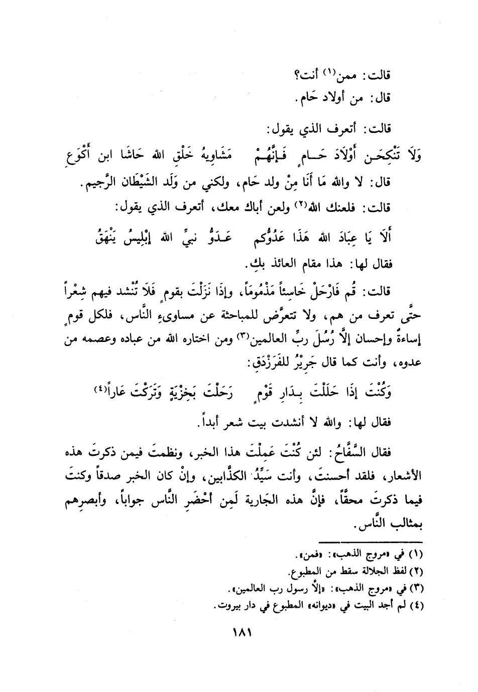 قالت: قم فارحل خاسئا مذموما، وإذا نزلت بقوم فلا تنشد فيهم شعرا حتّى تعرف من هم، ولا تتعرّض للمباحثة عن مساوئ النّاس، فلكل قوم إساءة وإحسان إلّا رسل ربّ العالمين [3] ومن اختاره الله من عباده وعصمه من عدوه، وأنت كما قال جرير للفرزدق: